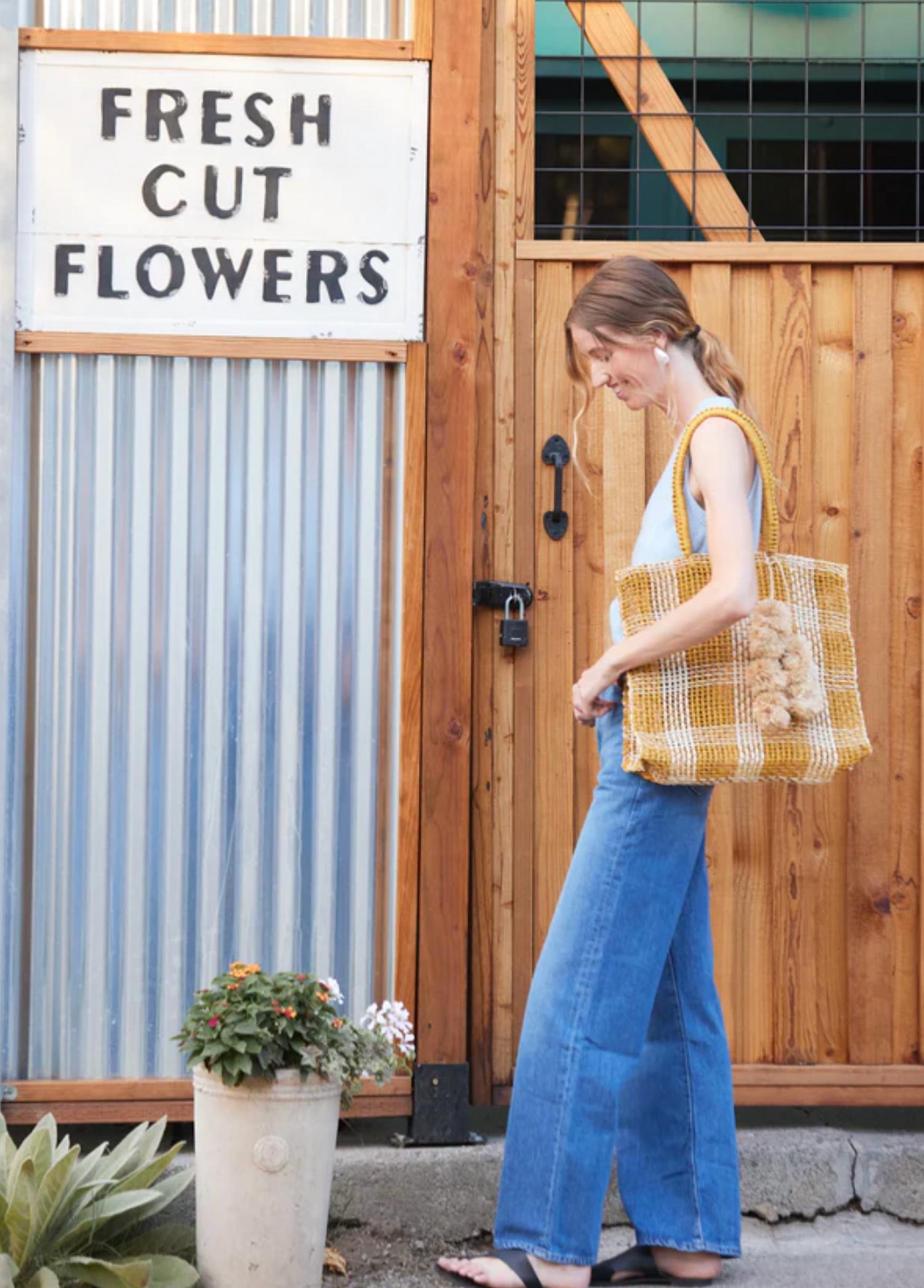 This open woven tote is made from durable, sustainable jute with raffia pom poms. It features over-the-shoulder straps and a spacious interior. The tote measures 16 inches wide, 14 inches high, and 4 inches deep, with a 10.5-inch handle drop. It is handcrafted by women cooperatives in the Philippines, Indonesia, and Malaysia, using traditional techniques.