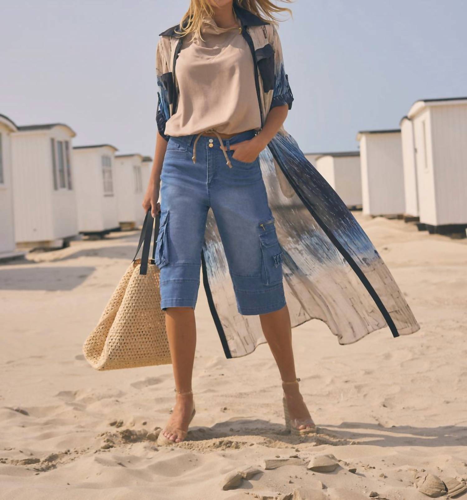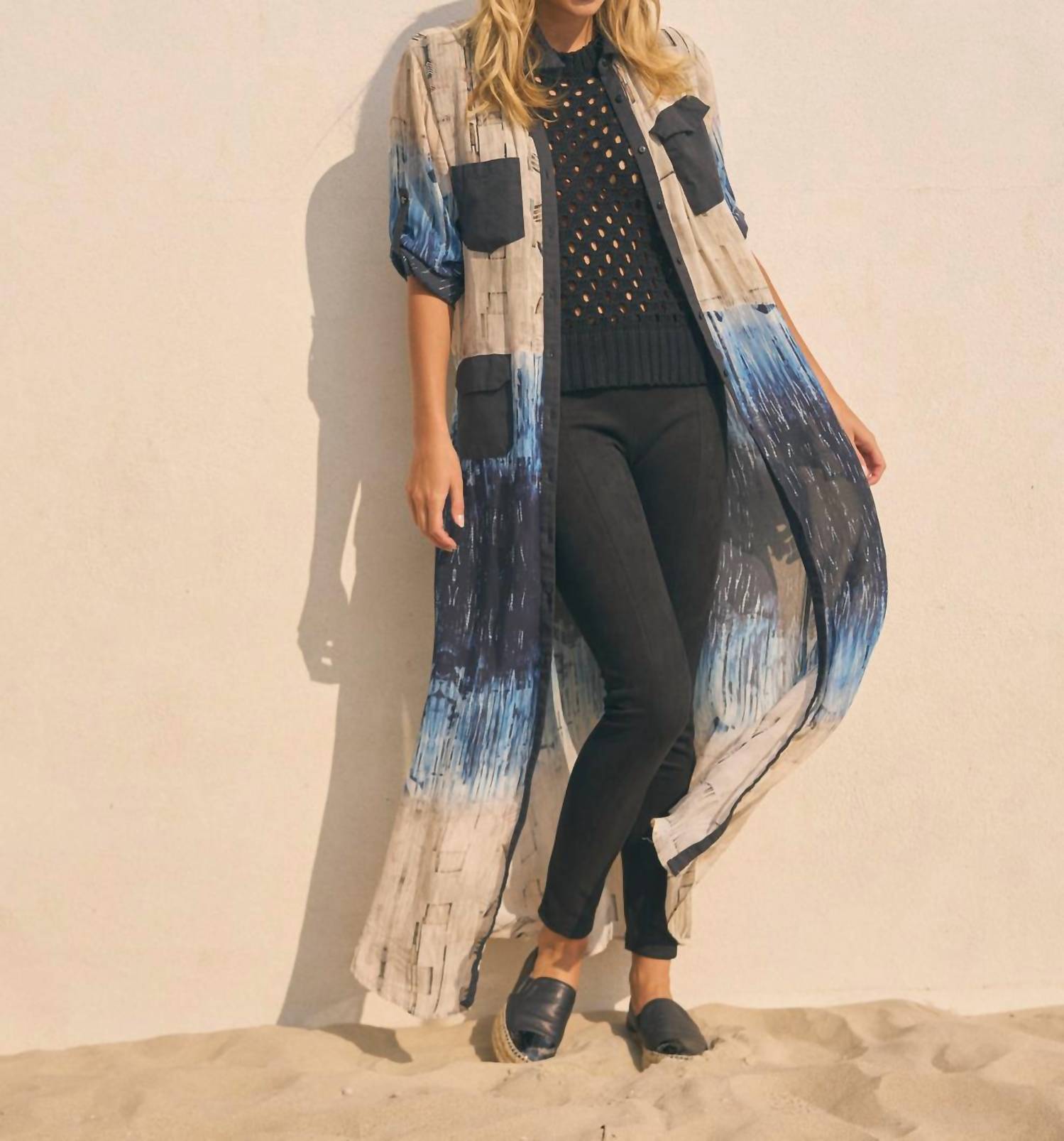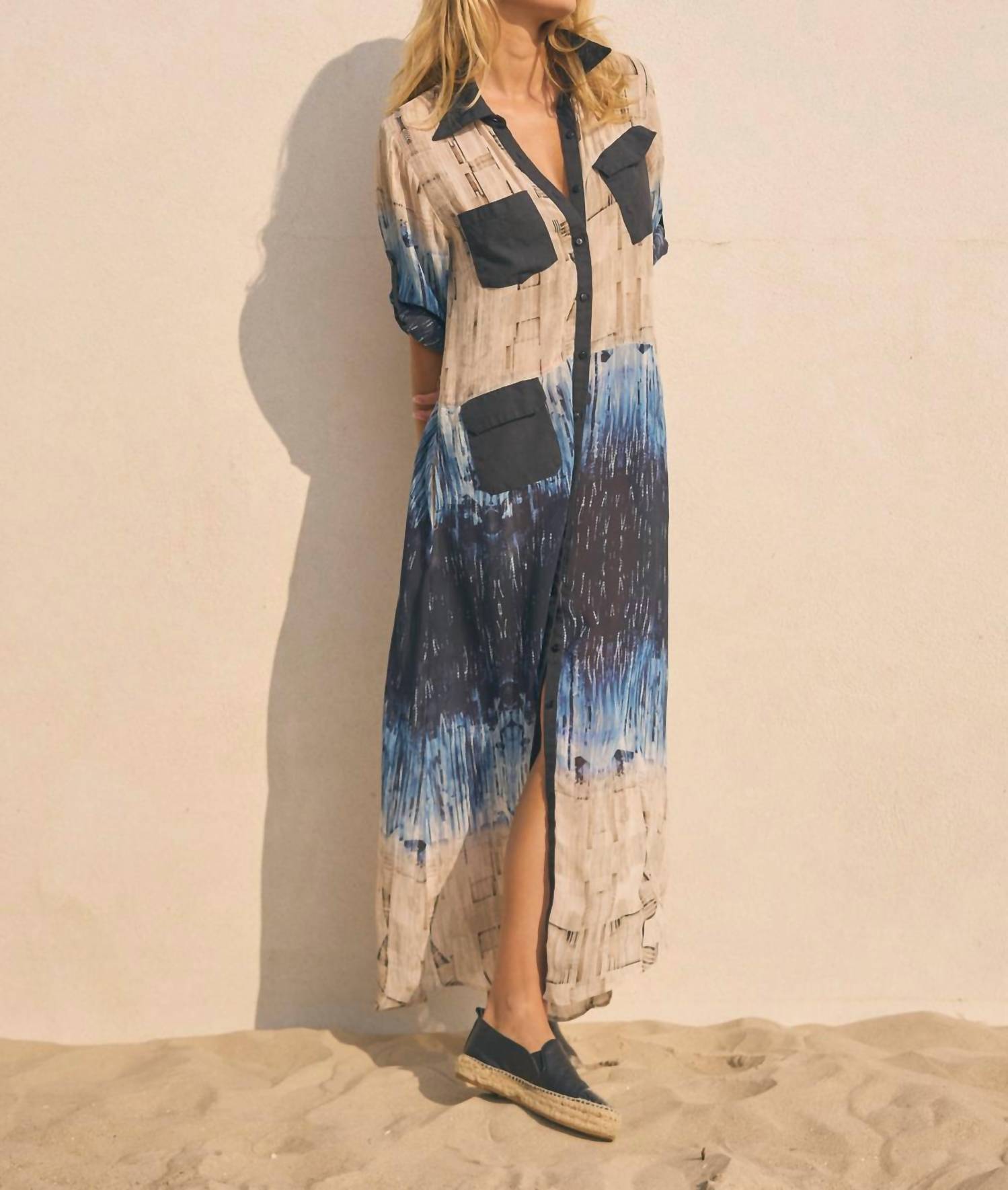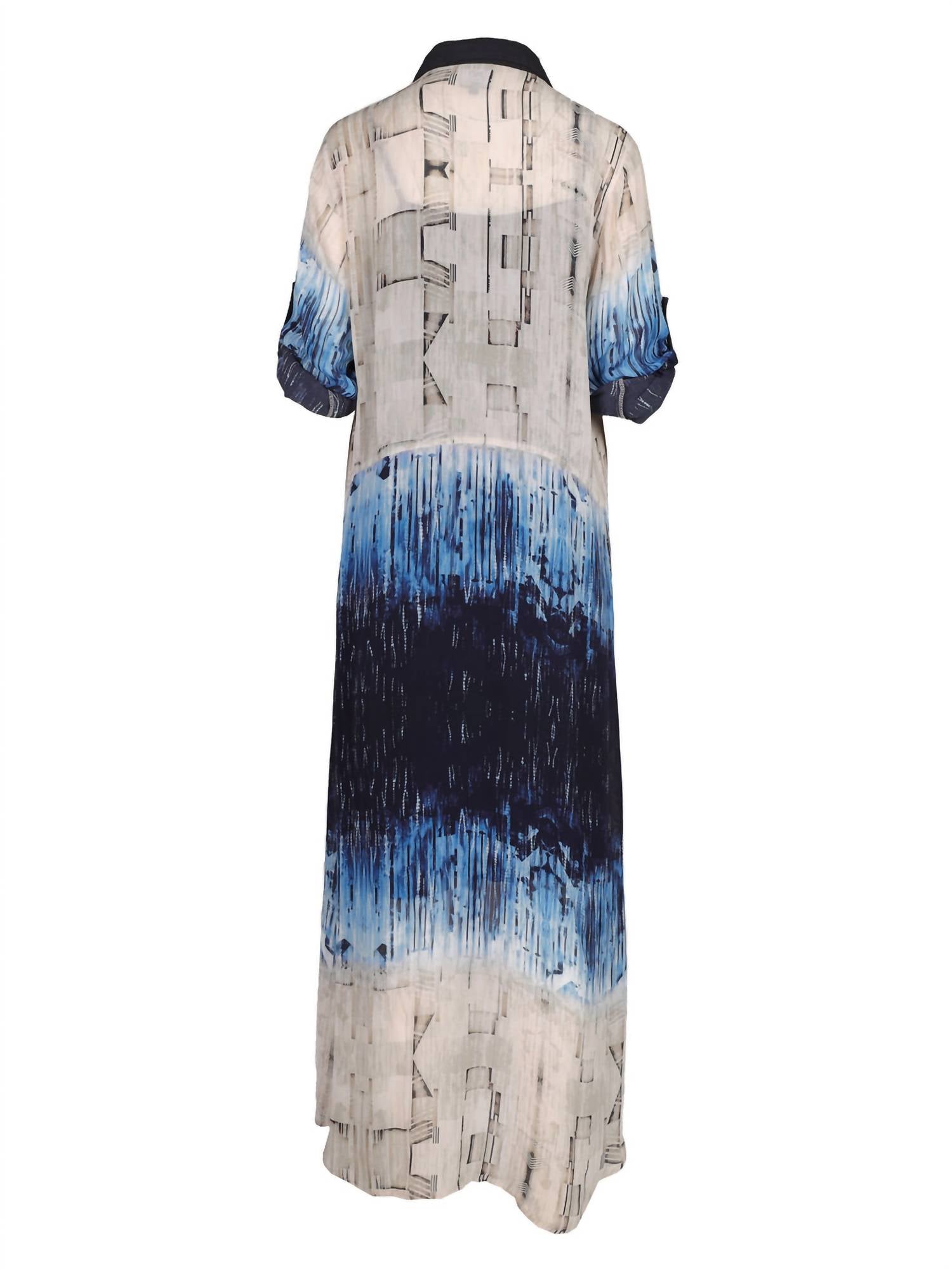 Unique shirt dress. Maxi dress shirt. Aztec cream and blue print with contrast collar. Three front pockets. Button closure. Plain shirt collar. 100% Sustainable viscose. Machine wash 40 degrees. Hang to dry. Do not tumble dry. Iron when moist at Low Temperature.