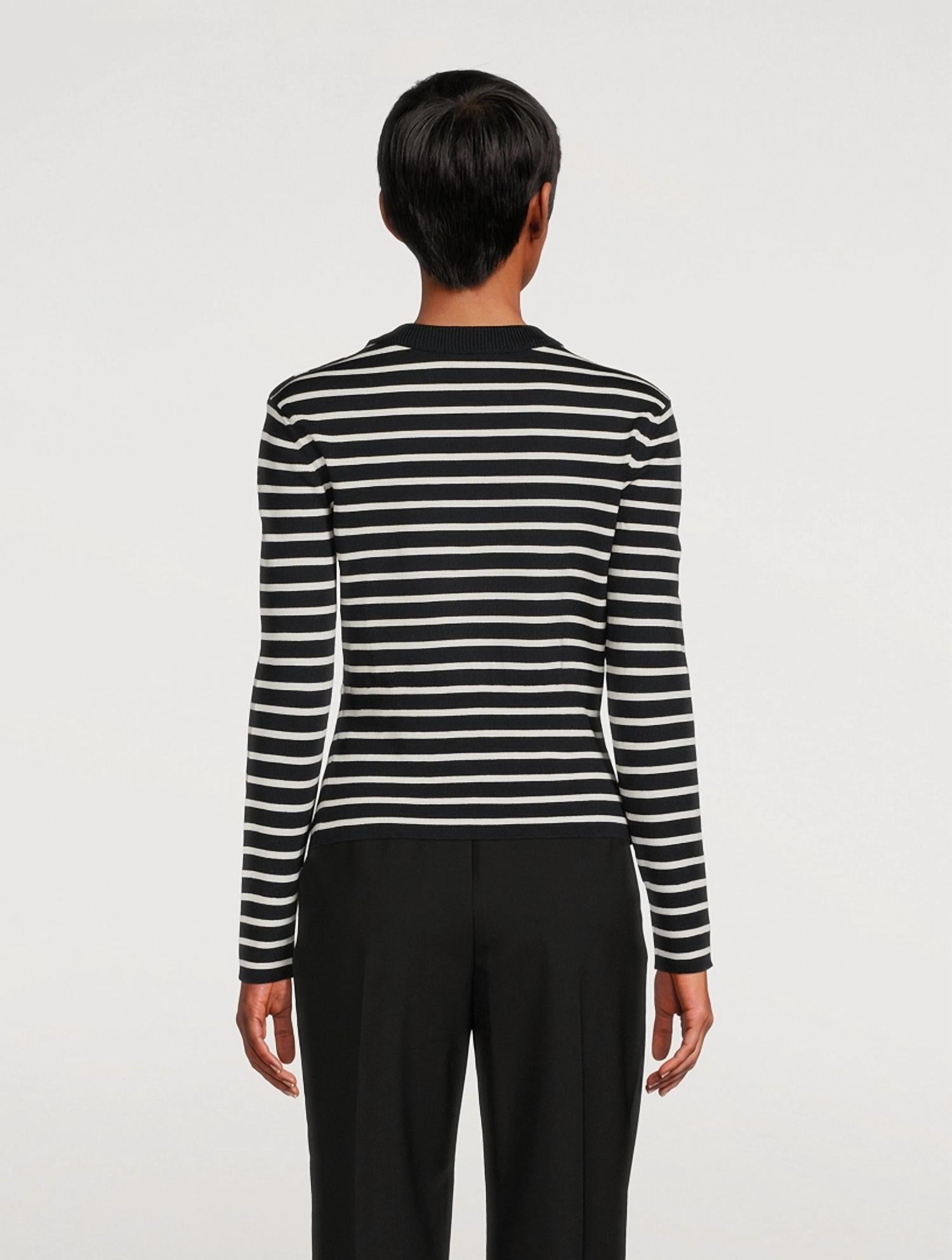 The ultimate go-to sweater, expertly crafted to provide the perfect combination of warmth and style. Its classic design and soft fabric make it a must-have addition to your wardrobe. Experience maritime elegance with the Asymmetrical Embellished Stripped Wool Blend Sweater by Alexander McQueen, crafted in Italy. This navy and white piece features long sleeves and a flattering 24-inch length, bringing a nautical-inspired touch with its Breton stripe pattern. Made from a luxurious blend of 87% wool, 11% polyamide, and 2% elastane, the sweater offers a comfortable and chic fit. Closure: Pull-on style. Care: Dry clean recommended.