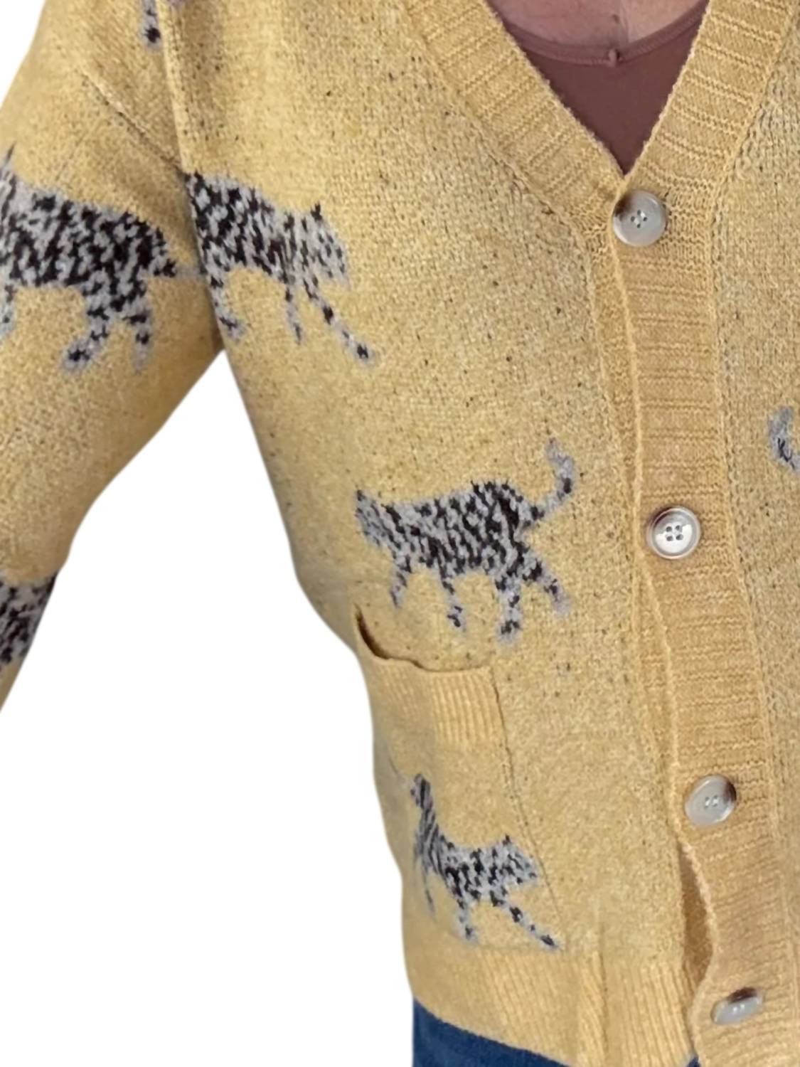 You'll be reaching for this comfy and classic v-neck sweater all season long. Introducing the Allie Rose Tiger Eyes V Neck Sweater, a playful and cozy addition to your fall wardrobe. This charming Misted Yellow cardigan comes with long sleeves and is adorned with black and white tiger patterns for a unique, boho chic style. Made from a comfortable blend of 74% Acrylic, 22% Polyester, and 4% Spandex, it features a button closure and two spacious pockets. Care instructions include machine wash cold on a gentle cycle, lay flat to dry, and steam low; do not bleach. Enjoy the dimensions provided for the perfect fit: S - Shoulder 20", Bust 21", Length 23.5", Sleeve 20"; M - Shoulder 20", Bust 21.5", Length 24", Sleeve 20"; L - Shoulder 22", Bust 22", Length 24.5", Sleeve 20.5".