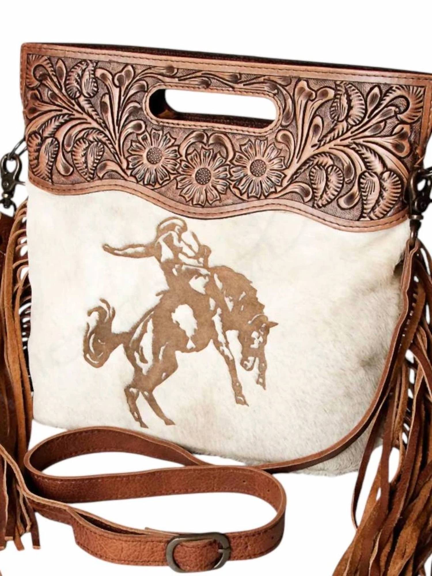 This crossbody bag will be your go-to bag of the season. Introducing the Cowhide Bronc Clutch Bag by American Darling, a stunning accessory that merges style and craftsmanship. This crossbody features genuine leather combined with white cowhide, showcasing a detailed etched bronc rider design. It includes a zip top with an interior side zip pocket and two side slip pockets, complemented by beautiful leather fringes for a western touch. The bag measures 12.5" tall and 14" wide, and comes with an adjustable and detachable smooth leather strap.