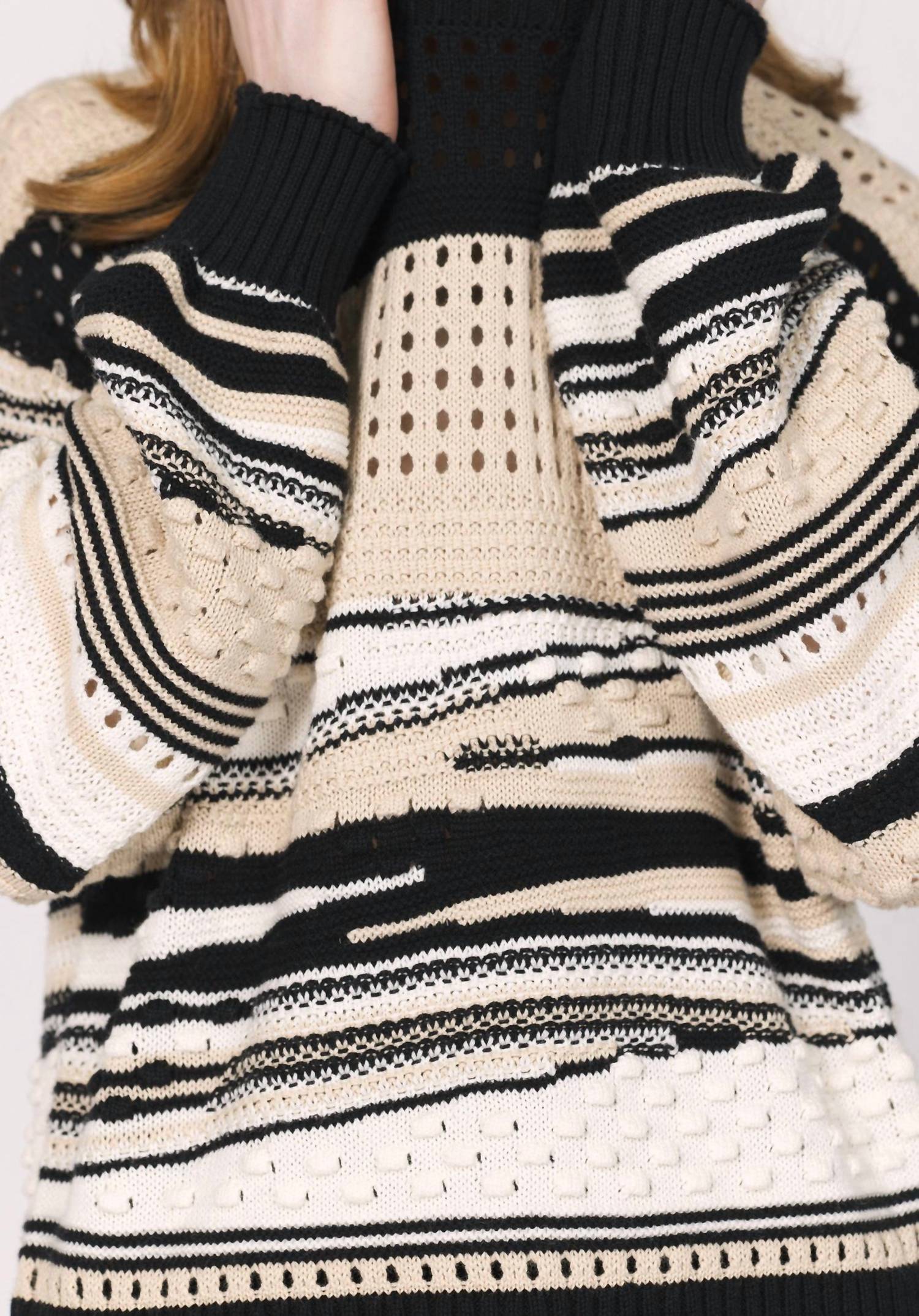 The ultimate go-to sweater, expertly crafted to provide the perfect combination of warmth and style. Its classic design and soft fabric make it a must-have addition to your wardrobe. Elevate your fall wardrobe with the Maryn Open Weave Sweater by Another Love, designed in an oatmeal and black mixed color way for a trendy, preppy look. This long-sleeve piece features a multi-stripe pattern with an open weave and textured dot detail, perfect for adding warmth and style during travel. The crew neck design allows for effortless layering. Closure: Pull on. Care: Machine wash and tumble dry.