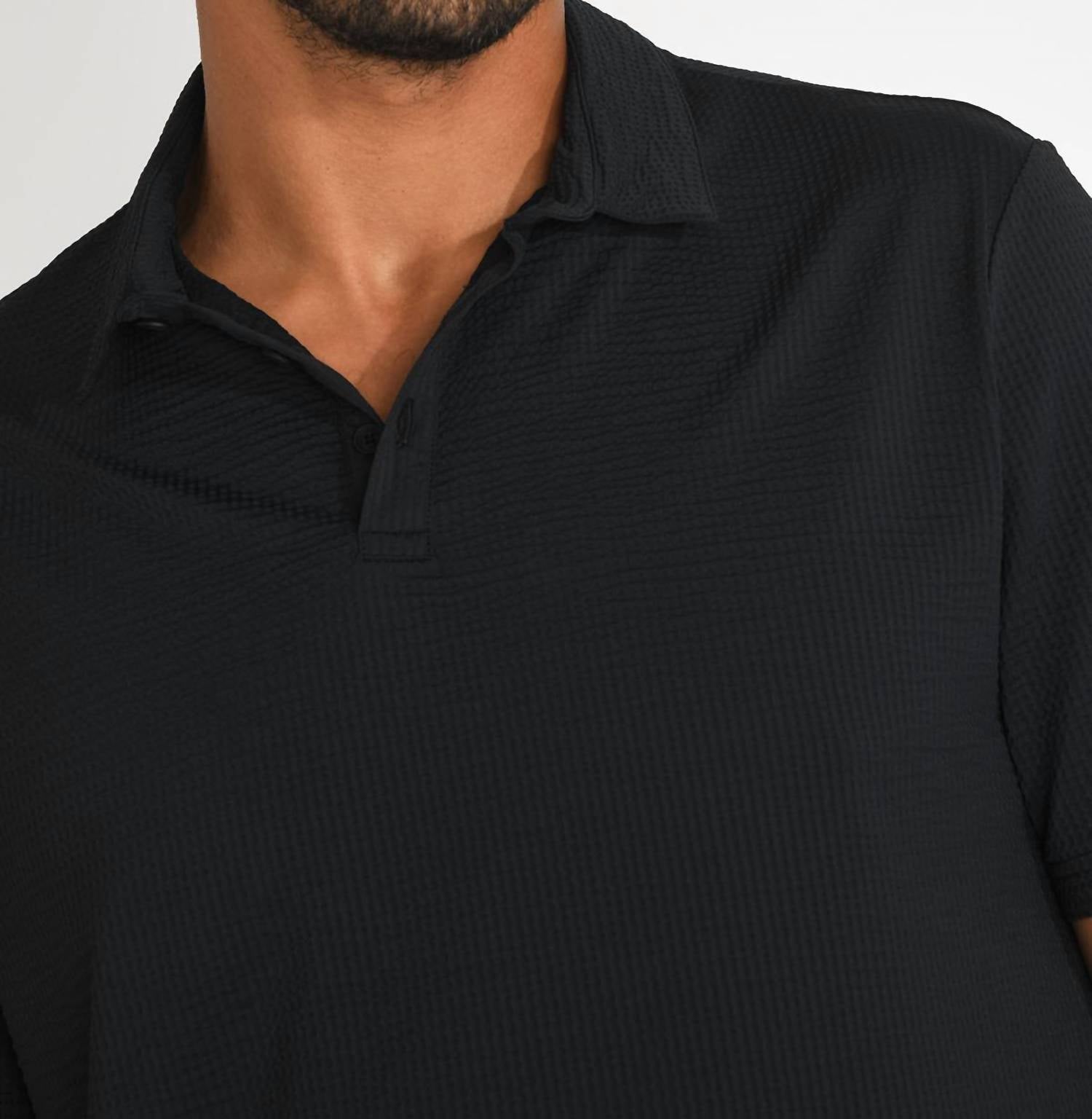 The CALA 1789 Vasco Trieste Polo Shirt is an embodiment of style and functionality, tailored for the modern man. This black, short-sleeve shirt features a waffle-textured pattern crafted from 88% Polyamide and 12% Elastane, ensuring it remains breathable, wrinkle-resistant, and pill-resistant. Its button closure and classic collar provide an elegant yet casual aesthetic, perfect for both professional settings and travel occasions. For care, machine wash at 30°C on a delicate cycle.