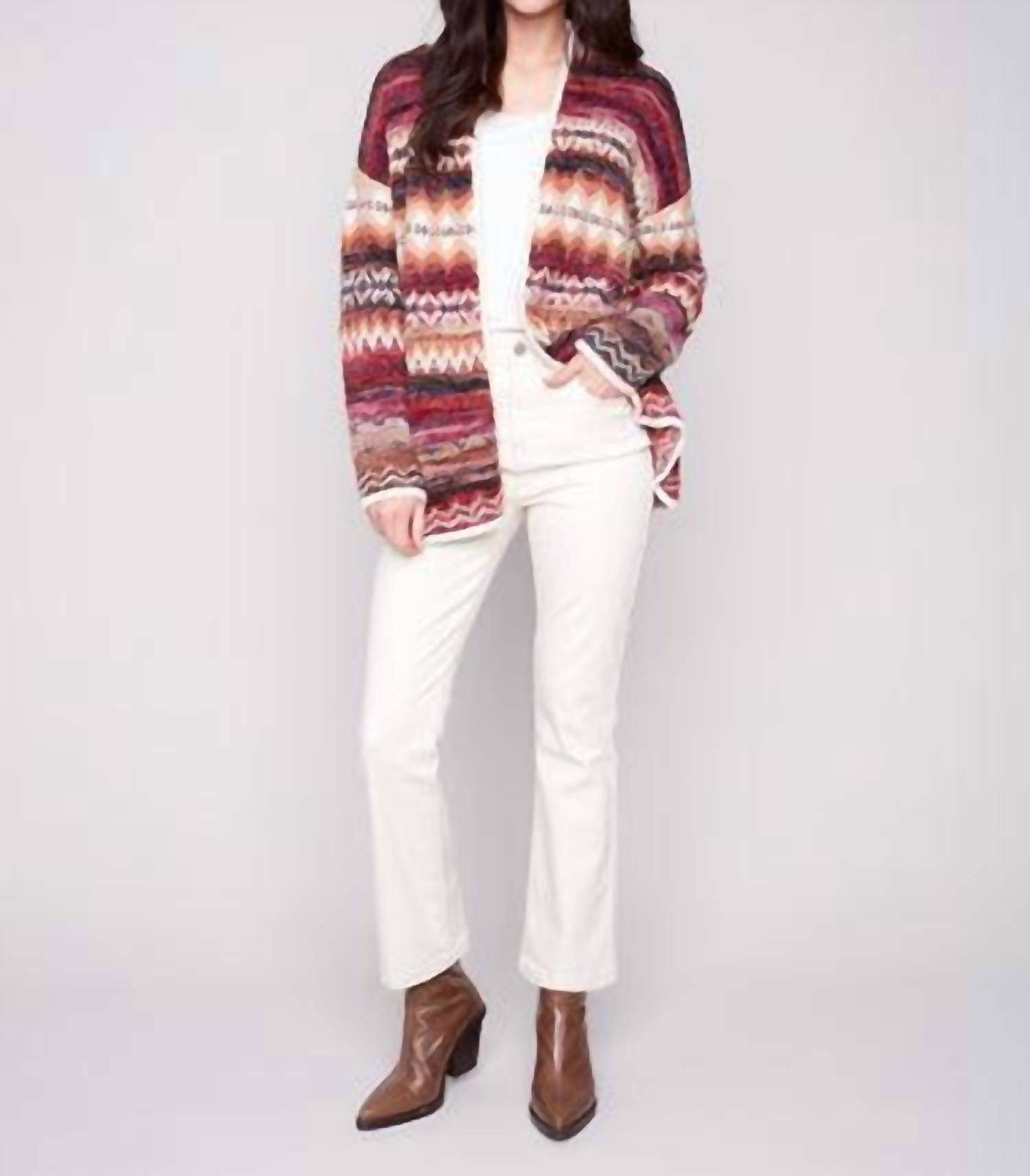 A classic fit that works just as good buttoned as it does left open. Introducing the Fireside Horizon Cardigan by CHARLIE B, a stylish piece in captivating jewel tones. This women's cardigan features a long sleeve drop shoulder design with a chic geometric pattern. With a convenient pull-on closure, its open front design and side seam pockets make it perfect for layering during fall excursions. Crafted for a boho chic vibe, it requires dry cleaning to maintain its elegant appeal.