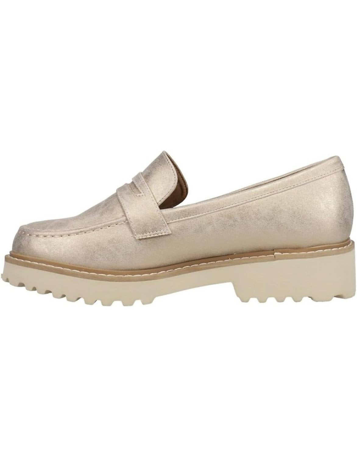 A preppy yet feminine take on the classic loafer. Slip into elegance with the Women's Boost Gold Metallic Loafers by Corkys Footwear, crafted from luxurious faux suede. These chic loafers boast a sophisticated round-toe design, set on a low, chunky 1.5" heel, perfect for a stylish and comfortable stride. Ideal for summer occasions, including anniversaries and Christmas celebrations, they embody the quiet luxury trend. Enjoy effortless style with these versatile loafers that seamlessly complement any wardrobe.