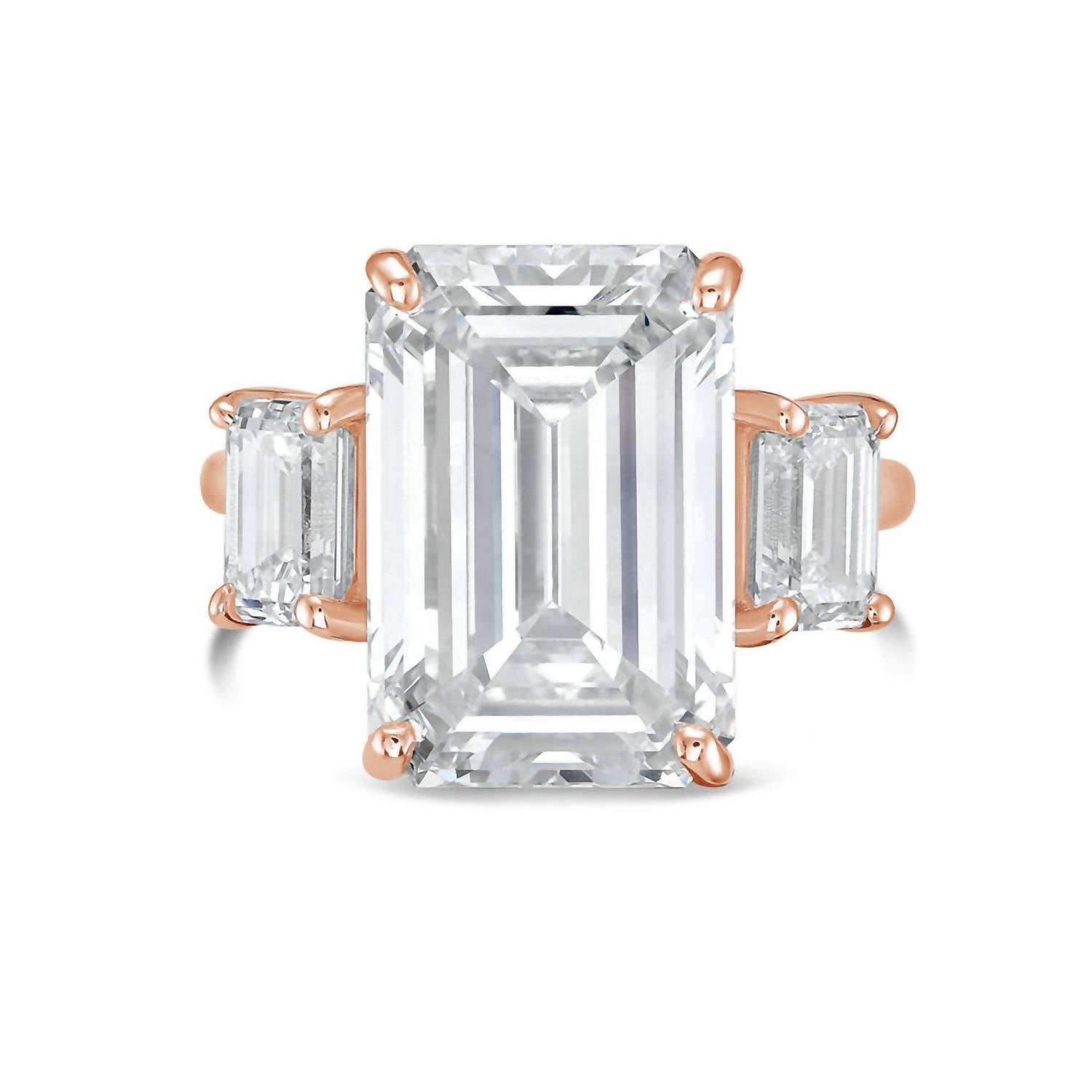 Wear this ring stacked or by itself... you can't go wrong. Introducing the 12.00 Ct Lab Grown Diamond Emerald-cut Three Stone Ring by Diana M Jewels, a stunning piece crafted in 18kt rose gold. This exquisite ring features a 12ct center stone with an additional 1.50 cts on the sides, all lab-grown diamonds with a high clarity rating of Very Slightly Included. The emerald-shaped stones are secured with a prong setting, ensuring stability and elegance. Ideal for those who seek sophistication in fine jewelry, it embodies premium color grades of D-f and originates from the highest standards in craftsmanship.