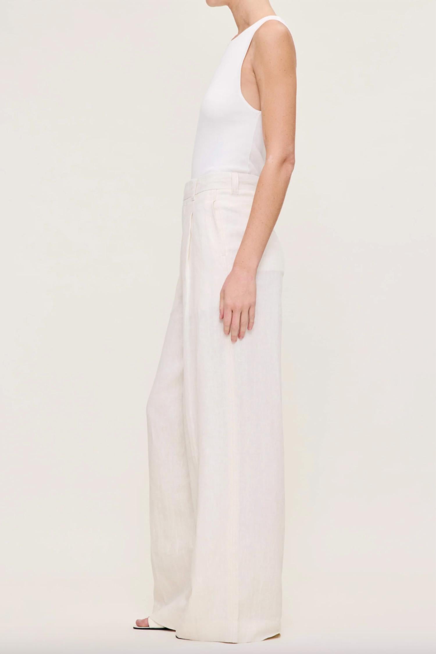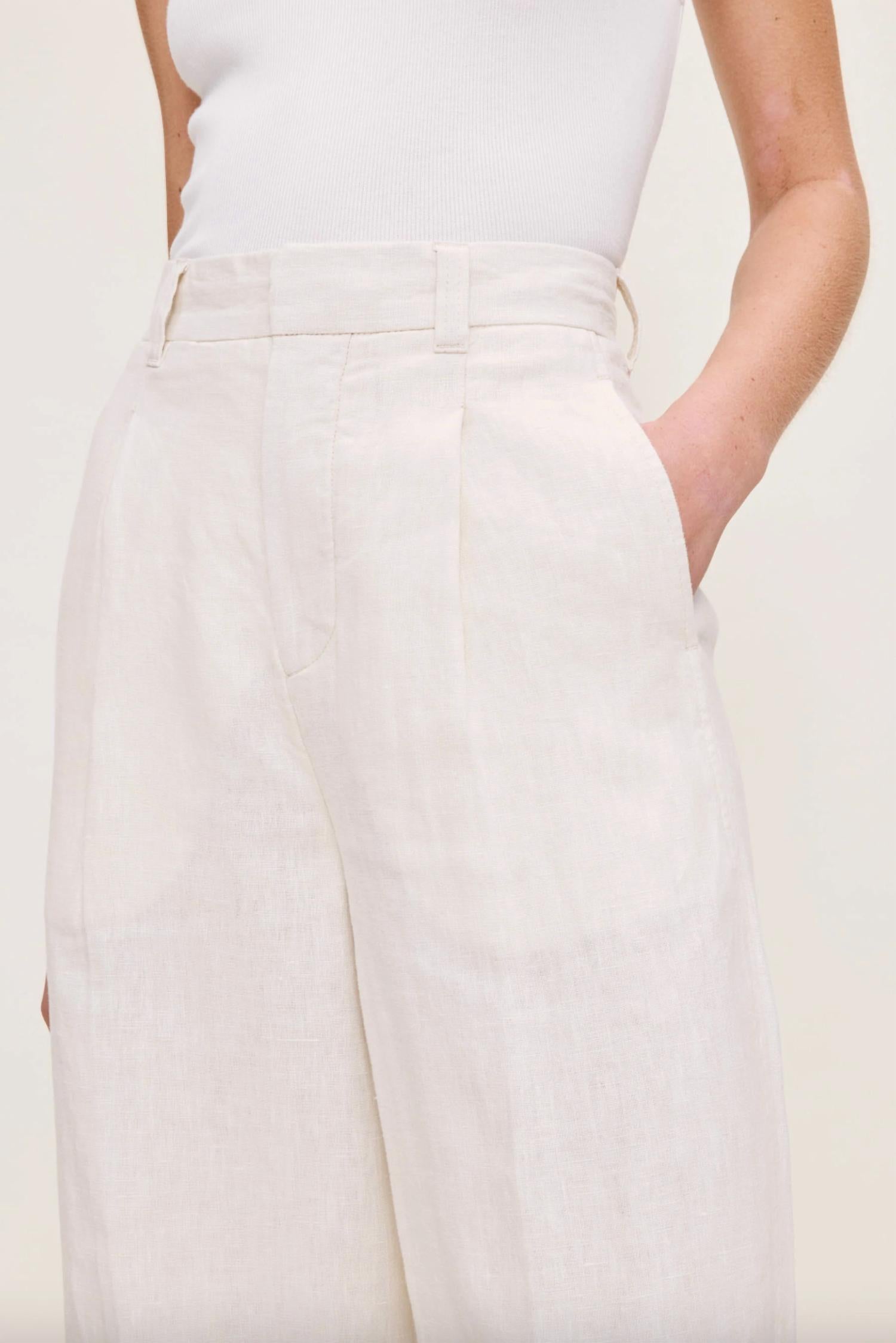 Introducing the Hepburn Wide Leg High Rise Pants by DL1961 - Women's, crafted for a chic and relaxed fit. These pants showcase a high-rise waist with pleating, providing an 11.5” rise and relaxed hip through leg design. Made from 100% linen in a warm Flax Linen color, they are equipped with a hidden interior hook and eye closure, seamlessly paired with pockets for practicality. Ideal for spring travel and workwear, their 32” inseam and 23.5” leg opening offer a polished look designed for comfort in high temperatures.