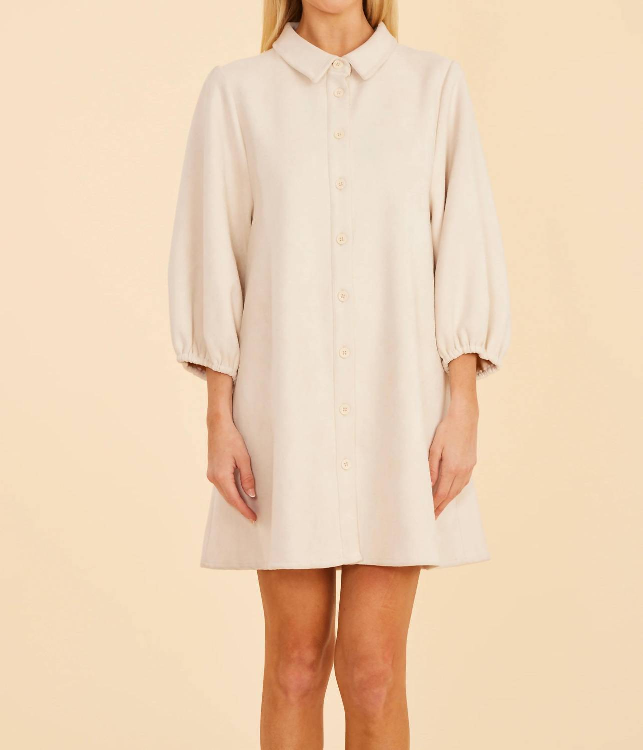 The pefect long sleeve dress for those cooler months. Elevate your autumn wardrobe with the Dolce Cabo Faux Suede Puff Sleeve Shirt Dress in a charming Creme shade. This mini dress showcases a playful A-line silhouette and three-quarter puff sleeves, crafted from soft faux suede for ultimate comfort. Closure: Button closure. Care: Dry clean recommended.