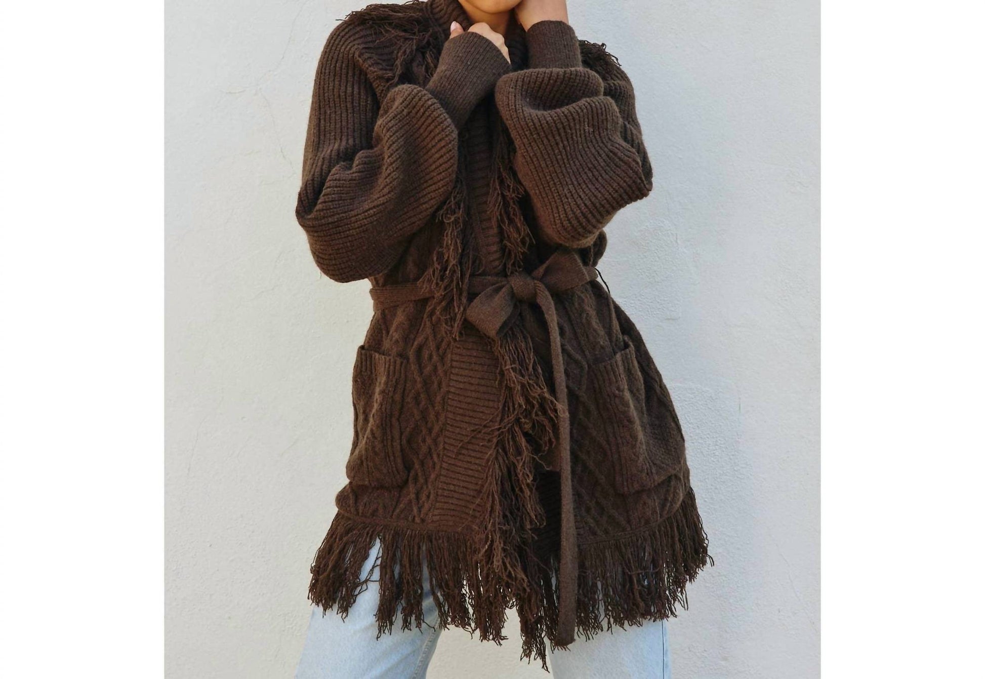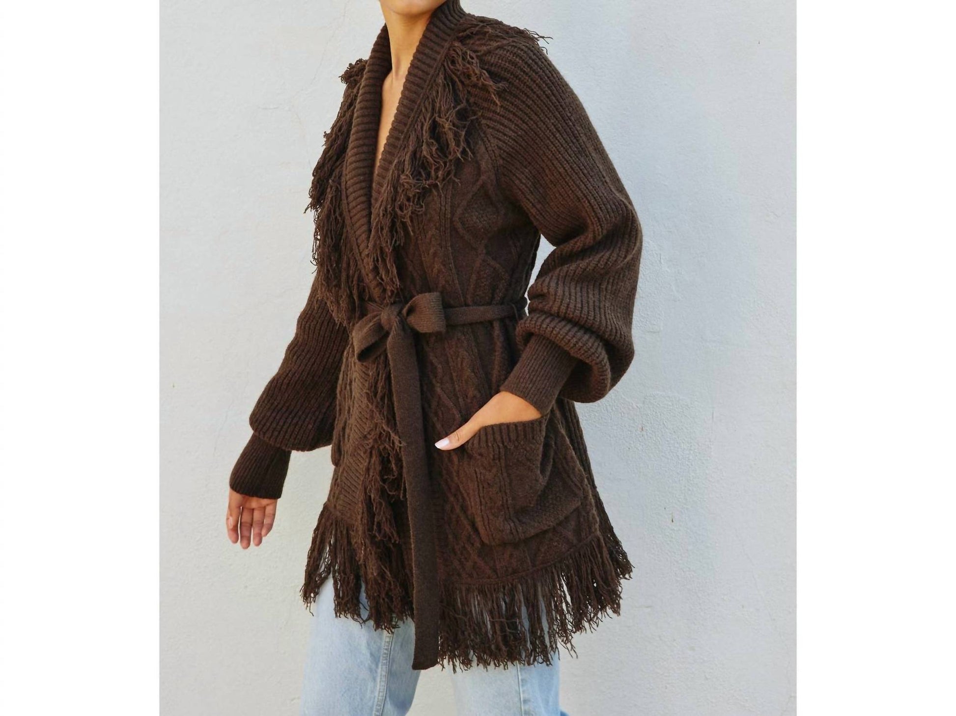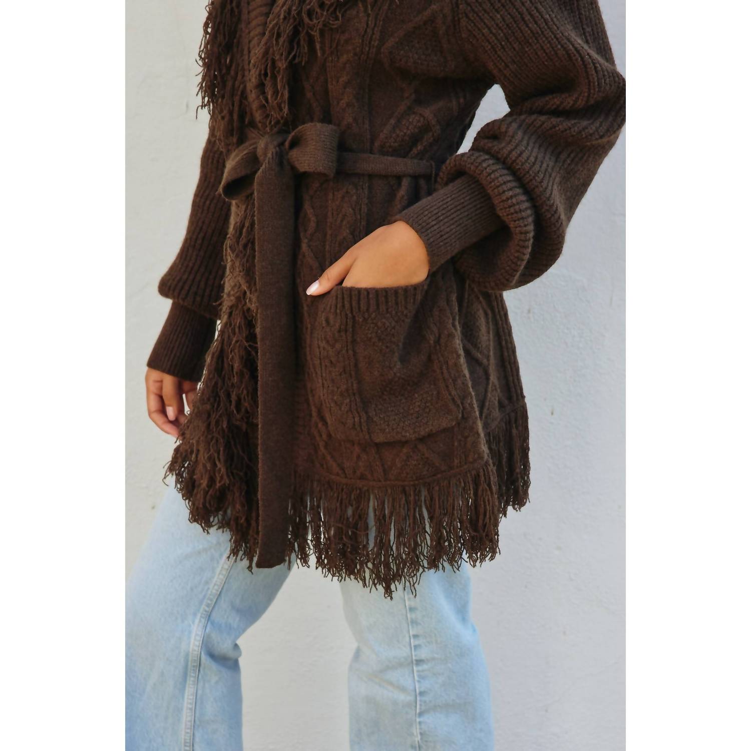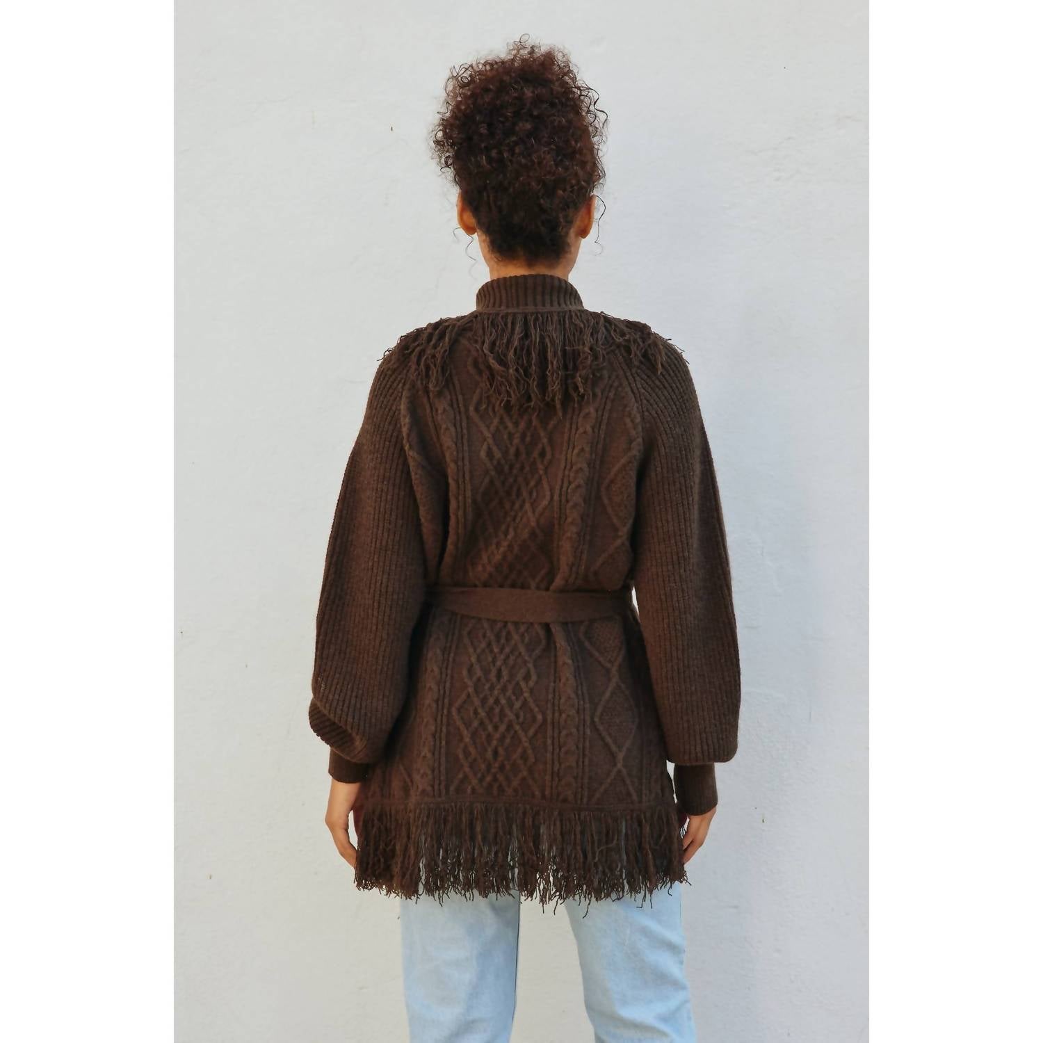 A classic fit that works just as good buttoned as it does left open. Wrap yourself in style with the Cable Fringe Detail Cardigan by DRESS FORUM, crafted in a rich brown hue for women. This long-sleeve cardigan showcases a tie closure, bubble sleeves, bold cable design, and fringe detailing at the neckline and hem, complete with practical patch pockets. Made from a cozy nylon blend of 55% Acrylic, 30% Nylon, and 15% Wool, it's perfect for the spring season. Care is simple with machine wash and tumble dry instructions. Models are wearing a size small (5'8" to 5'10").