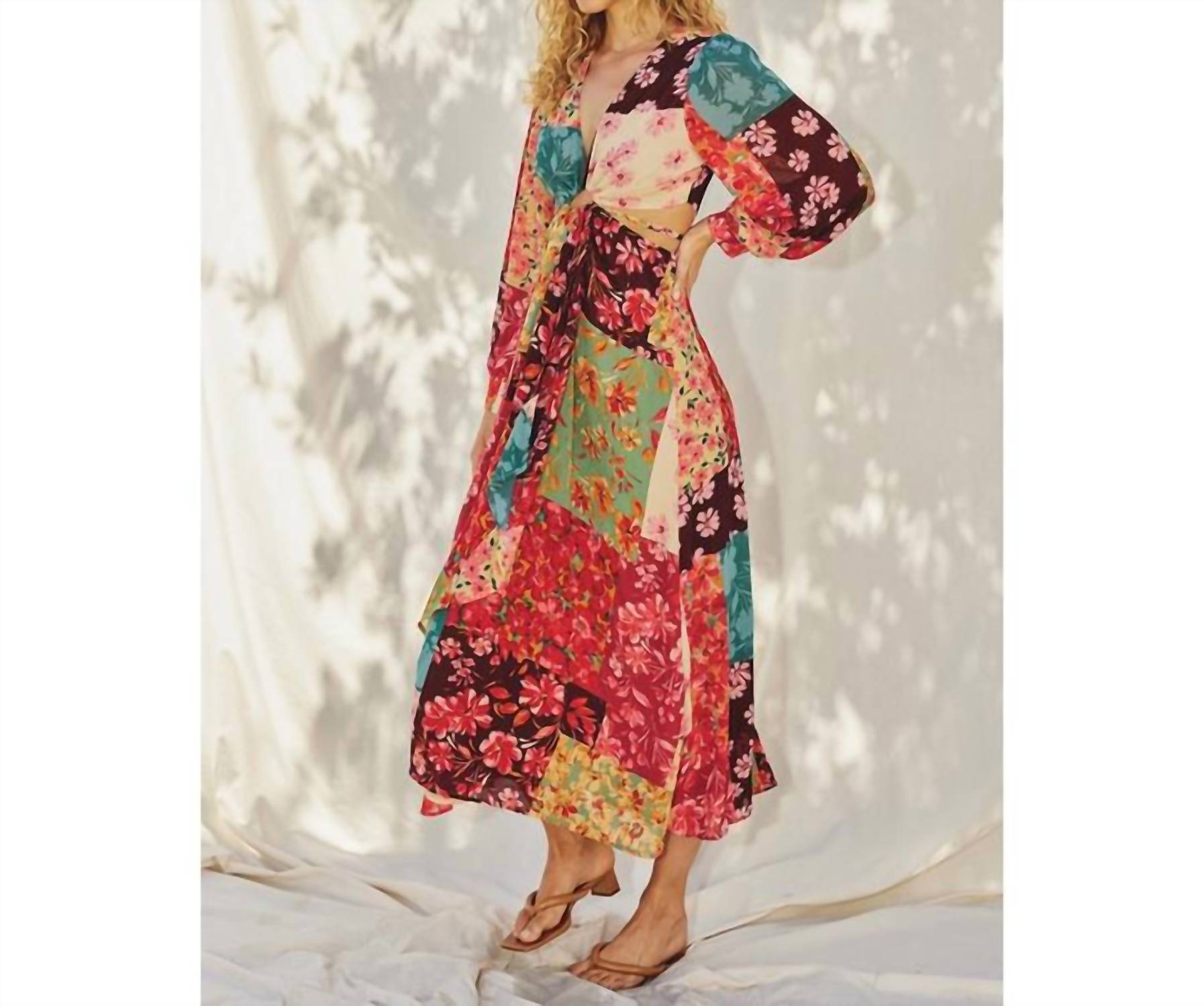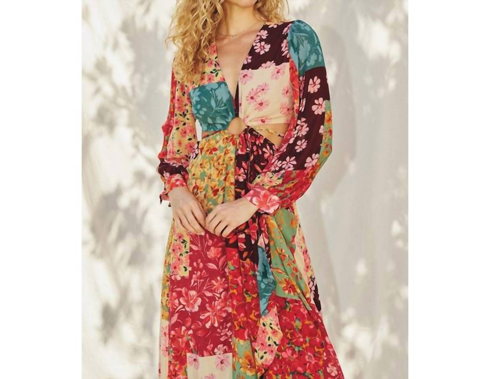 A flattering yet comfortable dress you'll be reaching for season after season. Discover the Mon Cheri O-ring Cut Out Long Sleeve Dress from Dress Forum, perfect for your next holiday party. This Rococo Garden floral dress features elegant bishop cuffed long sleeves and a chic V-neckline. Crafted from 100% Polyester, the design includes a flattering waist cutout with an O-ring detail and an overlapping ruffle hem, gracefully flowing into a midi/maxi length. Closure: Hidden back zipper.