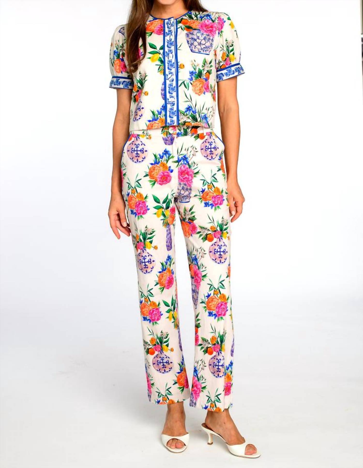 A timeless blouse that will never go out of style. Meet the Coco Short Sleeve Floral Top by Elizabeth James The Label, a chic addition for your spring wardrobe. Designed in a charming Ivory Ginger Jars floral pattern, this piece transitions effortlessly from a short sleeve top to a jacket. Made from luxurious cotton satin, it features a button closure, puffed shoulders, and decorative trim with piping accents for a touch of elegance. Perfect for vacation or Easter occasions, this versatile garment embodies the essence of Boho Chic style.