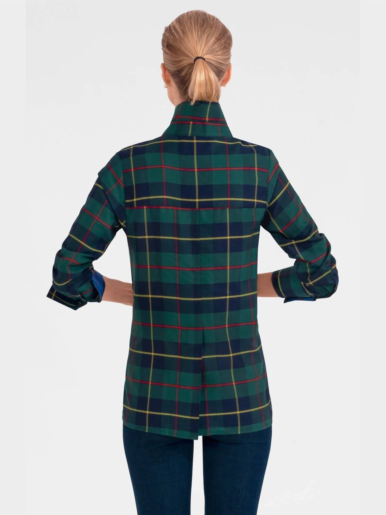 This button down shirt is comfortable yet polished. Introducing the Comfy Cozy Shirt by Gretchen Scott, a chic choice for the season in a refreshing green plaid pattern. Crafted with three-quarter sleeves and optional contrast turn back cuffs, this shirt offers a length of 26 inches and a stylish shirttail hem. It features a button closure with shell buttons and coordinating fabric accents on the inside back panel, inside cuffs, and front placket. This women's shirt is machine washable, making it an easy addition to your spring vacation wardrobe.