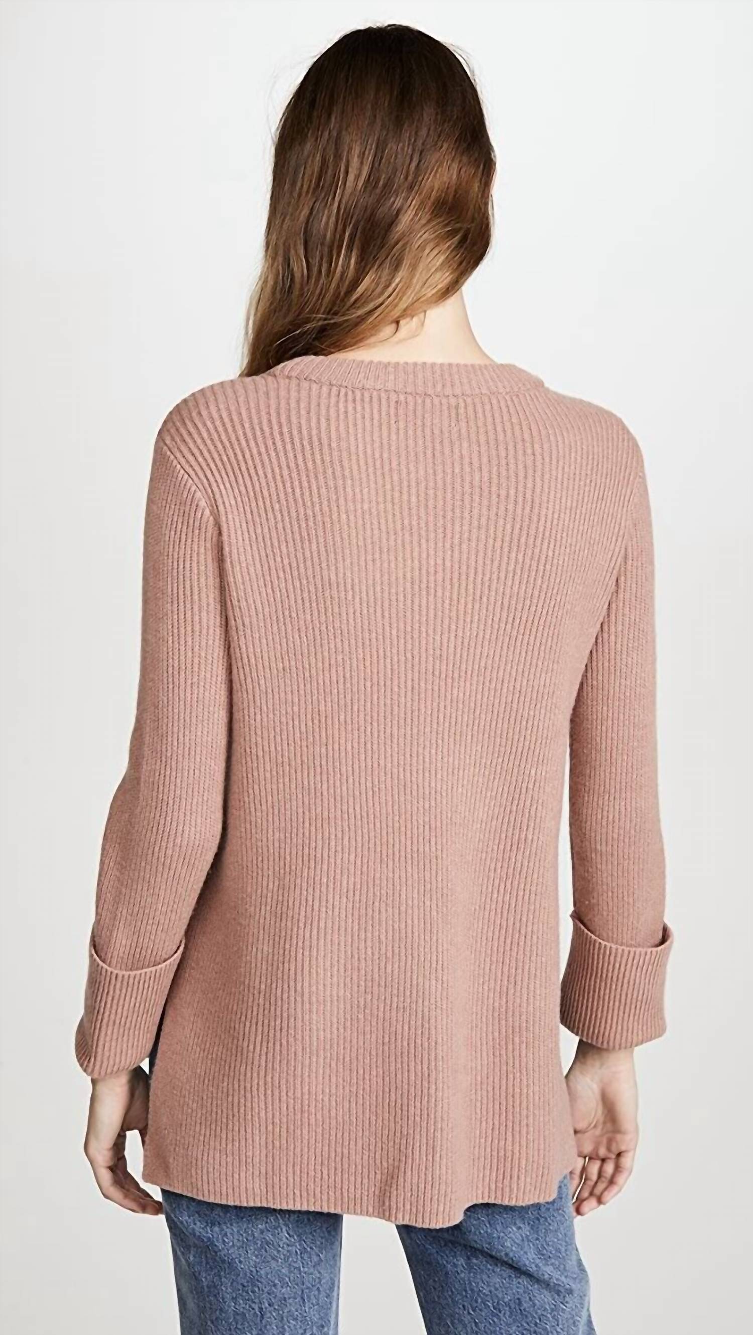 Introducing the Women's Cecile Knit Sweater by Hatch, a chic maternity piece perfect for a minimalist fall wardrobe. This sweater, crafted from a luxurious blend of 90% merino wool and 10% cashmere, features long sleeves and a comfortable crew neck. With its ribbed knit and split high-low hem, this pullover style offers a stylish tunic-length silhouette. Imported from China, it is easy to care for with options for hand washing or dry cleaning. Ideal for a dinner party or Thanksgiving occasion in elegant Rosewood Pink.