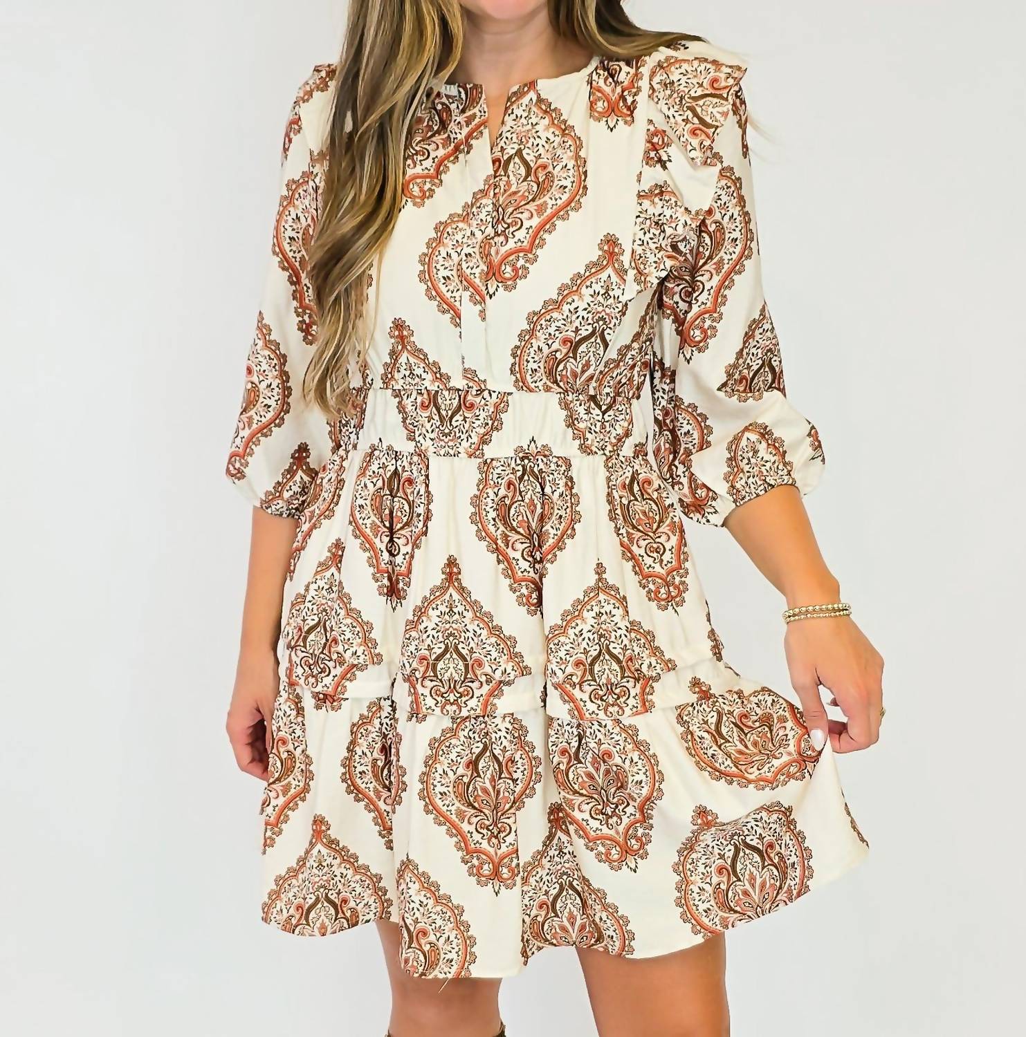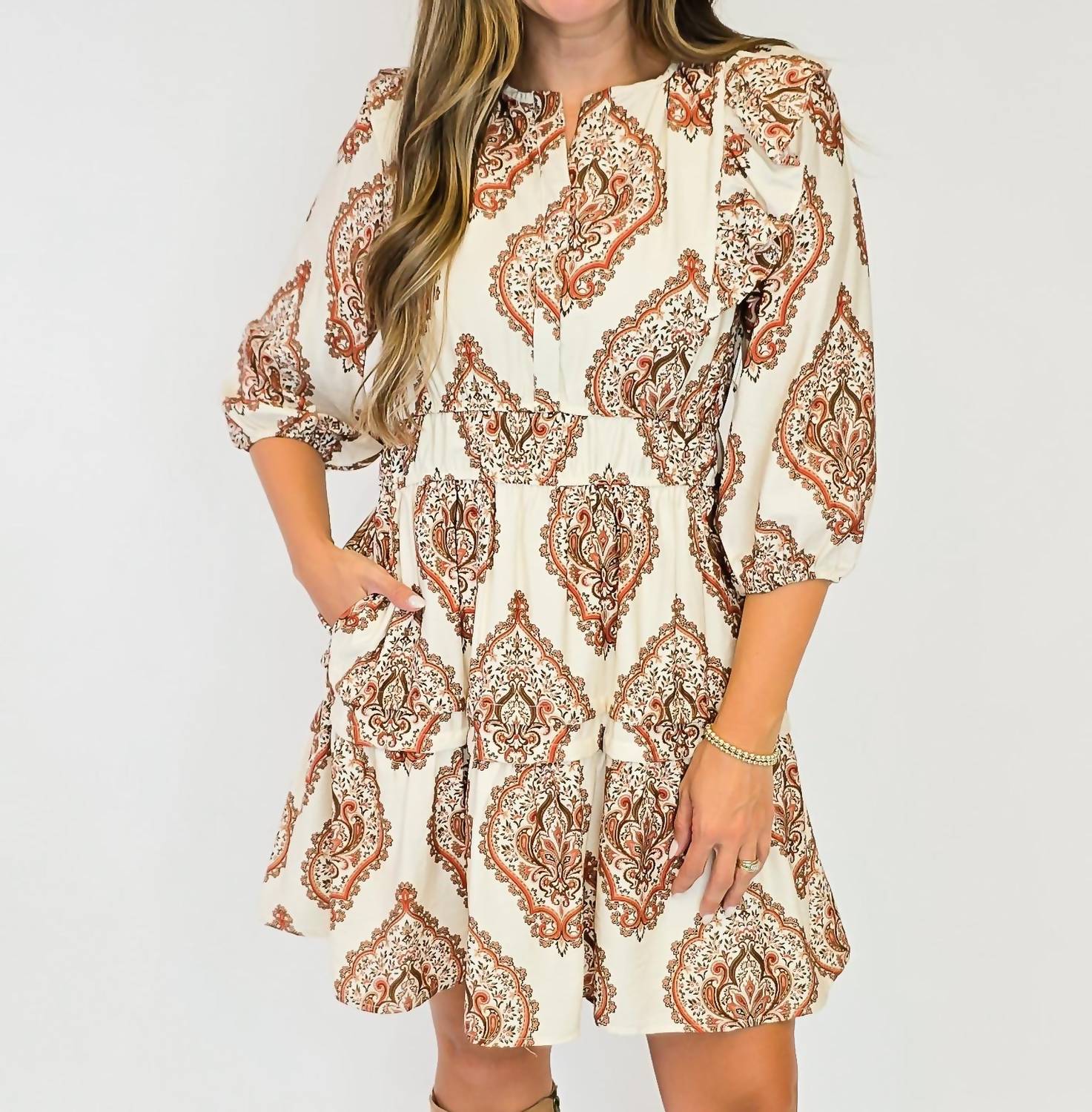 The perfect mini dress for those warmer months. Embrace effortless style with the Boho Puff Sleeve Print Short Dress by Hayden LA, a perfect choice for summer occasions. Crafted from 80% Rayon and 20% Nylon, this mini dress features three-quarter sleeves with elastic cuffs, a rounded neck with snap closures, and a tiered silhouette for a chic, free-spirited look. Designed with practical side pockets and an elastic waist for a flattering fit, it measures 34" in back length. Care for this beautifully lined piece by hand washing cold, avoiding bleach, and hanging to dry. The model is 5'6" and wears size small.
