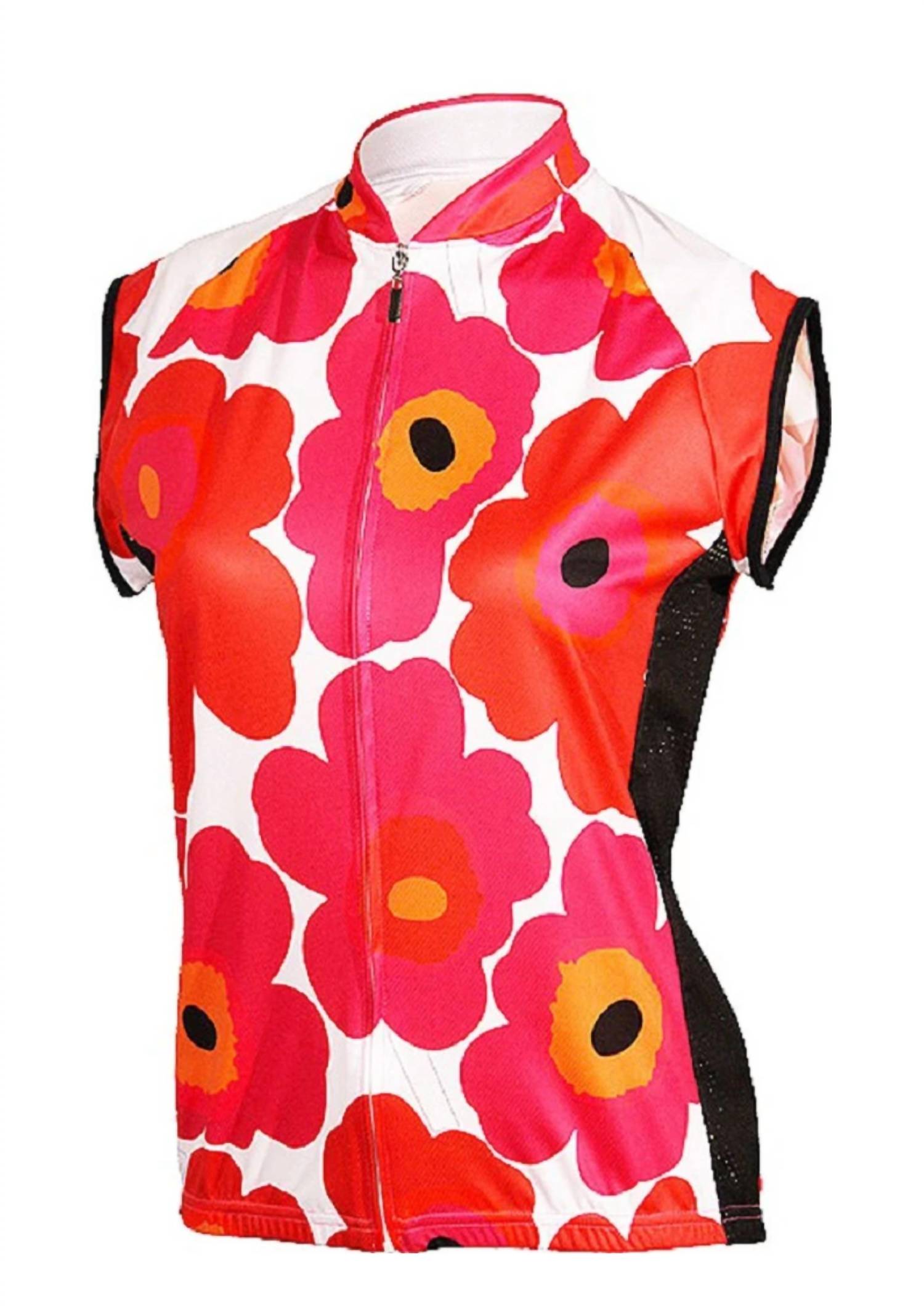 Elevate your cycling experience with the Women's Sleeveless Cycling Jersey by It's In My Heart, featuring a vibrant flower print. Crafted from moisture-wicking polyester with a superior club-cut fit, it offers 4-way stretch mesh side panels for enhanced airflow. The jersey is equipped with a pro-style 19" front zip closure and three rear pockets, providing practicality and ventilation. Designed with an extended back for optimal coverage, this USA-made jersey is perfect for active days.