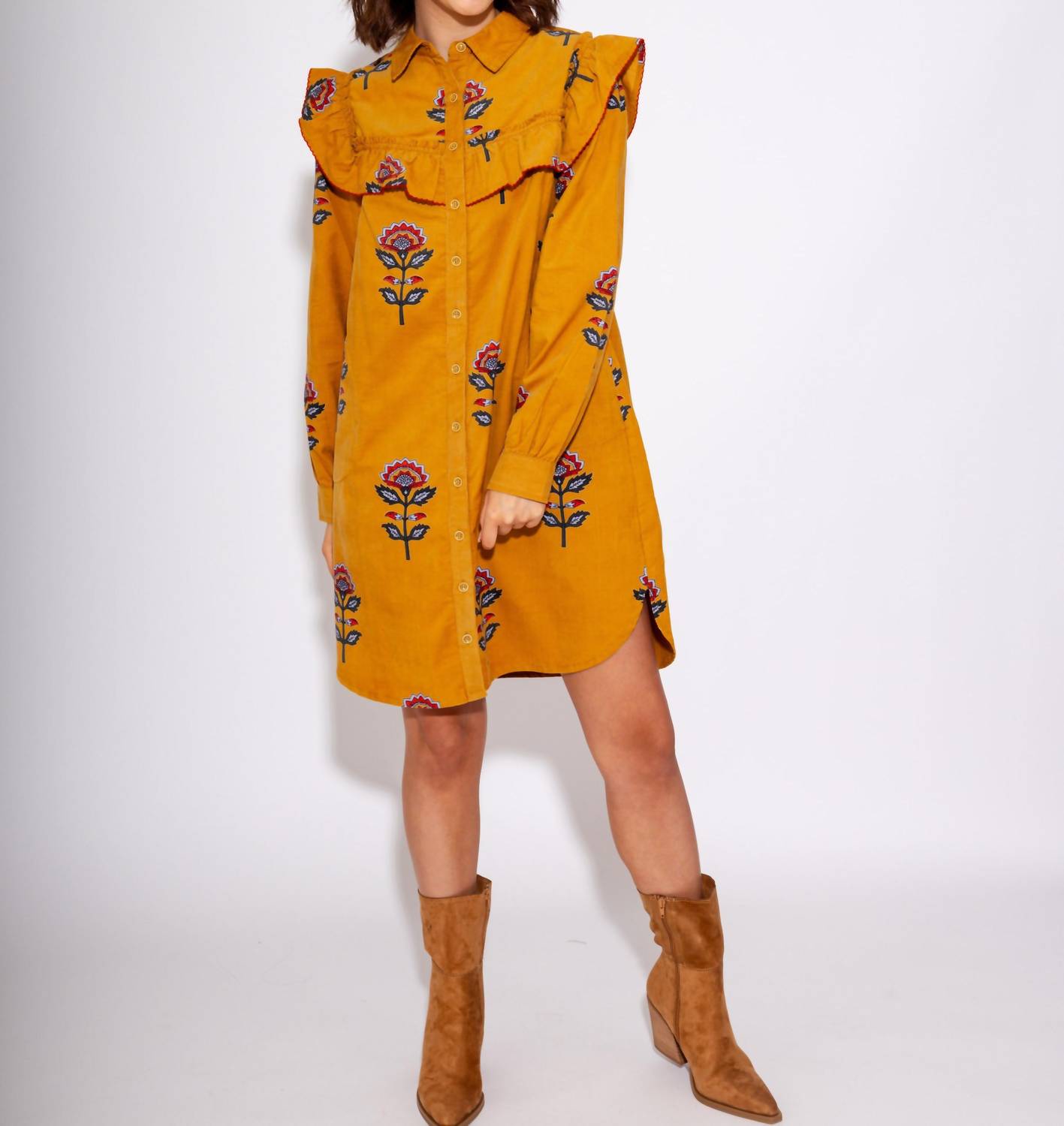 A short and breezy dress for those warmer days. The Ivy Jane Ruffled Yoke Shirt Dress, in an elegant mustard-gold floral print, is a boho chic addition to any wardrobe. This mini dress features long sleeves, a collared neckline, and a playful ruffled yoke for a touch of feminine charm. Closure: Button closure. Perfect for concert outings and casual days alike, it's designed to offer a timeless yet trendy appeal.