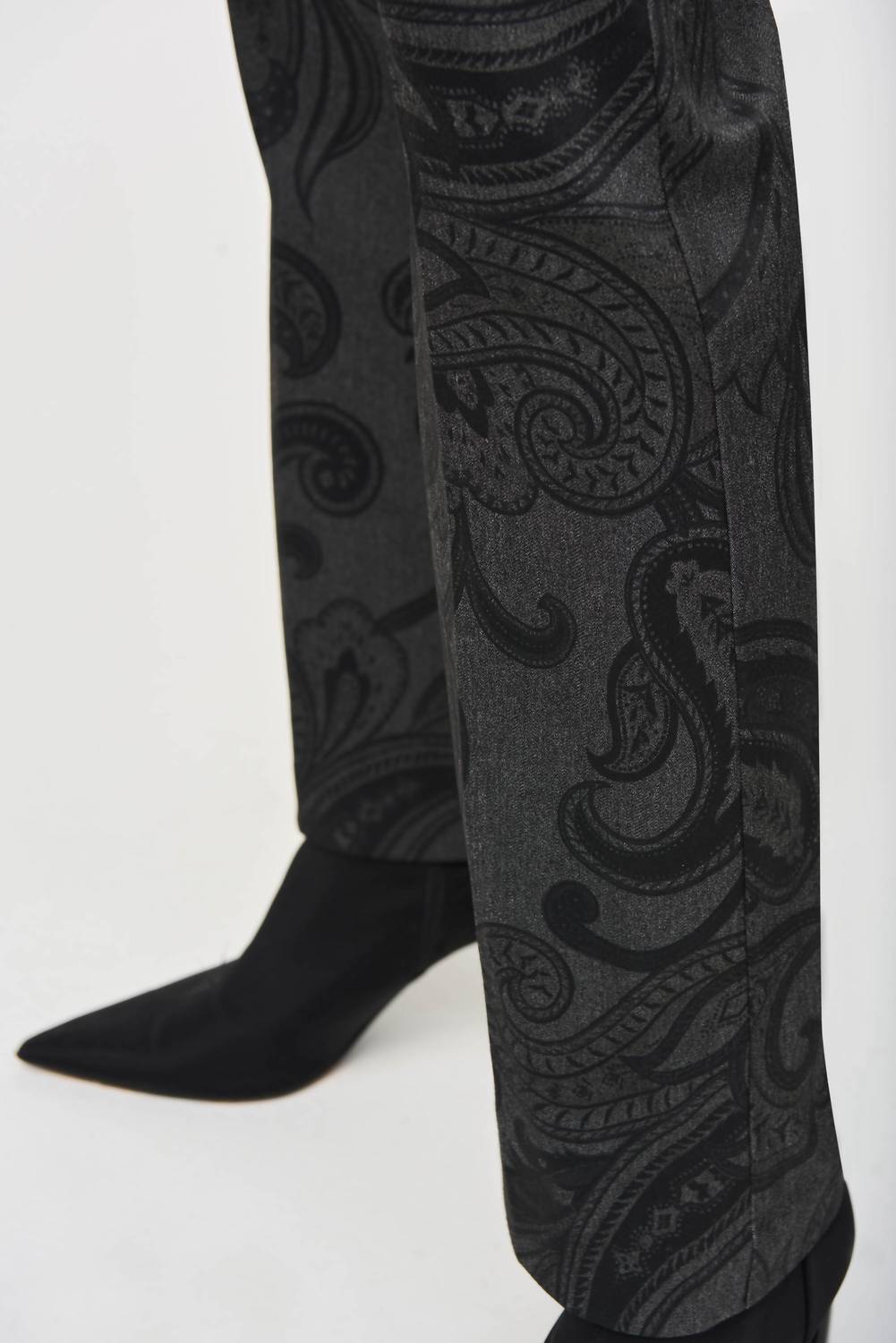 Elevate your wardrobe with the Paisley High Rise Trousers by Joseph Ribkoff, a stunning fusion of classic style and luxurious detail. These full-length trousers feature a straight, flared leg with a slim fit, showcasing an opulent paisley brocade in black and grey. Crafted from 96% Polyester and 4% Spandex, they are designed for both comfort and sophistication. Made in Canada, they feature a convenient pull-on closure and are best maintained by hand washing and line drying. The inseam measures approximately 31 inches, perfectly versatile for any evening event.