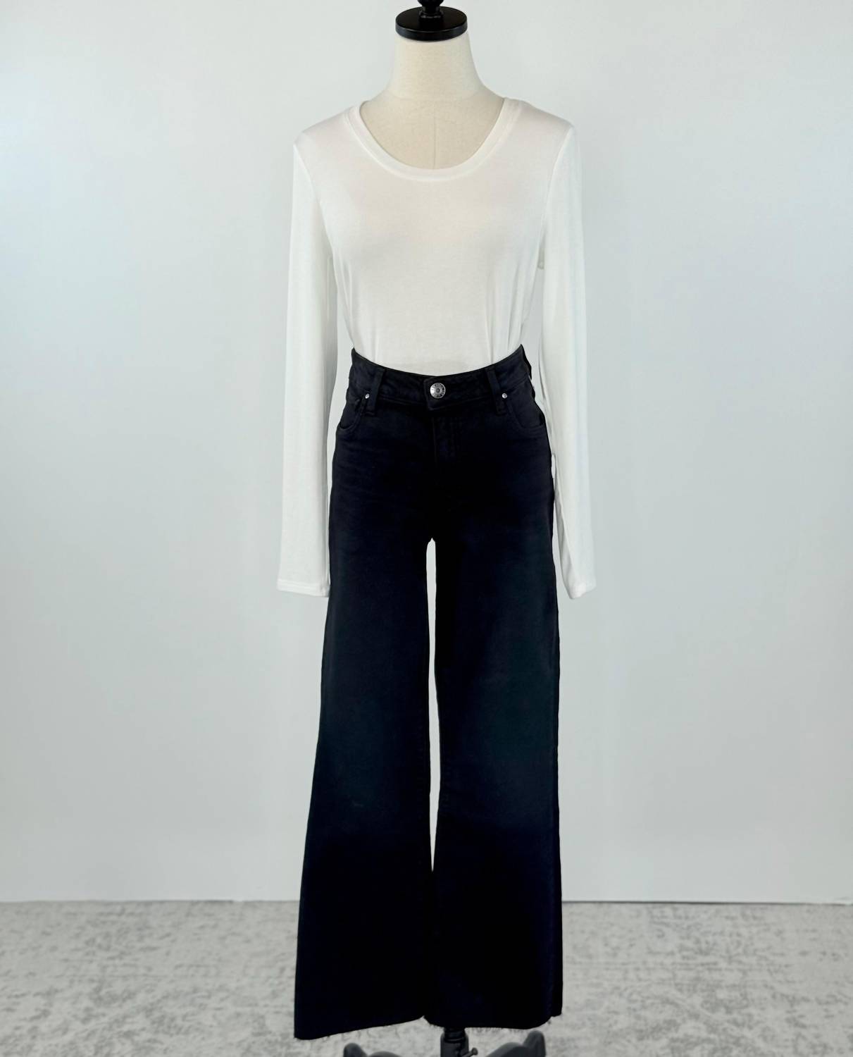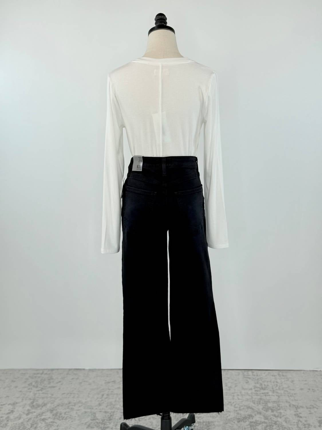 Tuck your favorite tee into these high-waist jeans for a more casual-cool feel. Discover the Kelsey High Rise Jeans by KUT FROM THE KLOTH, crafted for a stylish yet comfortable fit in bold Firm Black. These jeans feature a modern raw hem, enhanced by the signature Fab Ab pockets for a flattering silhouette. Made from a cotton blend of 77% Cotton, 14% Lyocell, 7% Polyester, and 2% Elastane, they provide a touch of stretch. With a high-rise waist and a wide-leg style, these jeans offer a regular fit with an inseam of 27.5" and a rise of 10.25". Closure: Zip closure. Care: Machine wash, tumble dry. Available in sizes 0-14.