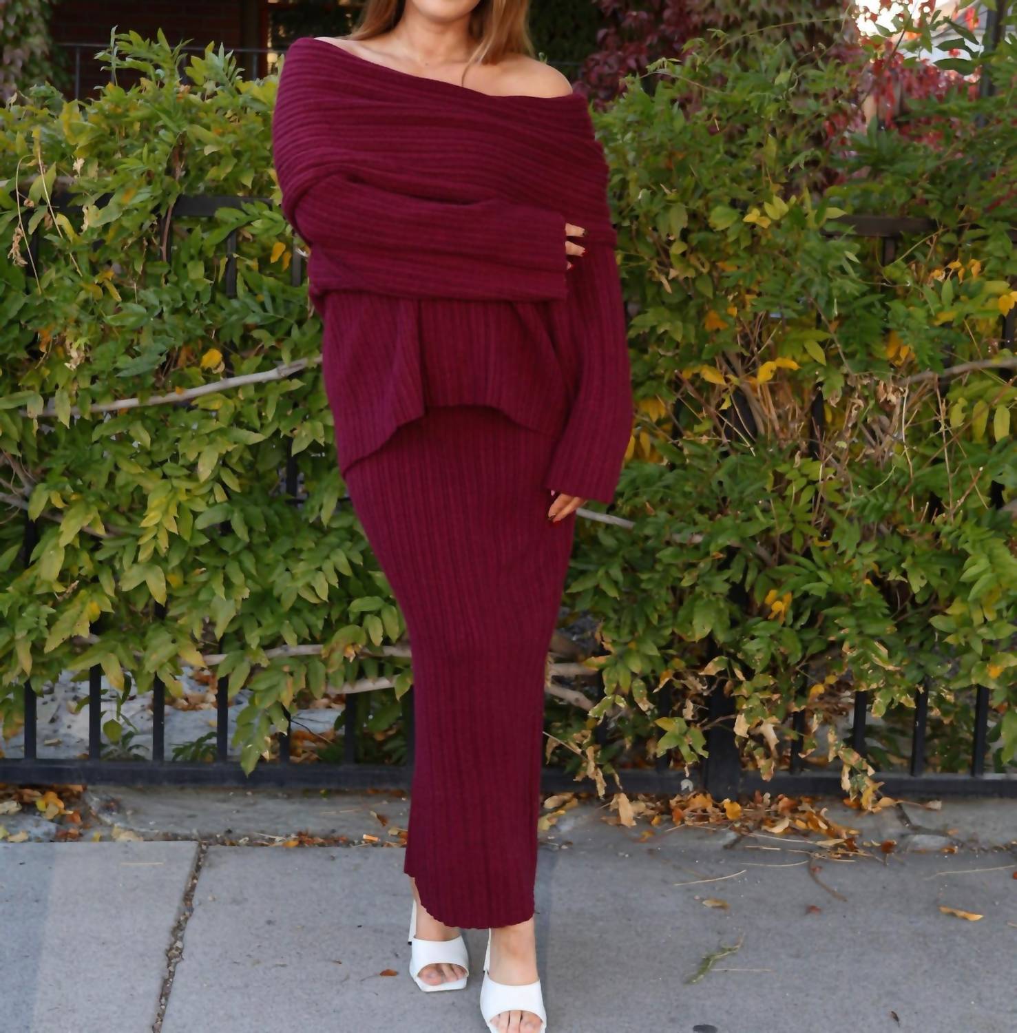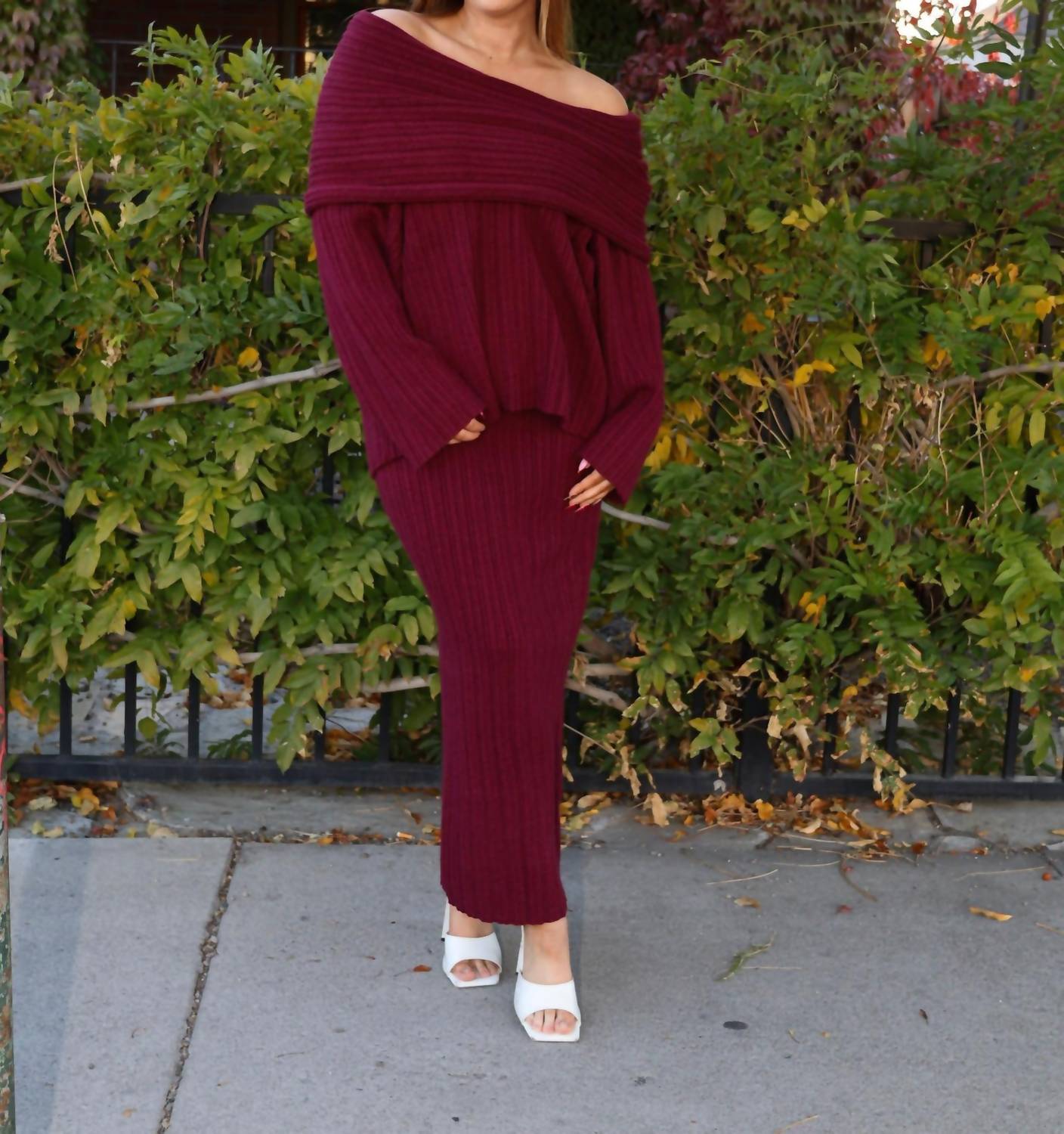 Show a little skin in this perfectly designed off-the-shoulder sweater. Introducing the Rhyka Off Shoulder Sweater by LE LIS, an essential piece for fall with its cozy-chic design in rich burgundy. Crafted with a soft ribbed knit texture, this long sleeve sweater offers a minimalist look with an oversized fit, perfect for holiday parties. Composition: 48% Acrylic, 28% Polyester, 24% Nylon. Closure: Pull on. Care: Machine washable. Model info: Natalee is wearing an XS, and Kylie is wearing a M, ensuring a true-to-size fit with decent stretch.