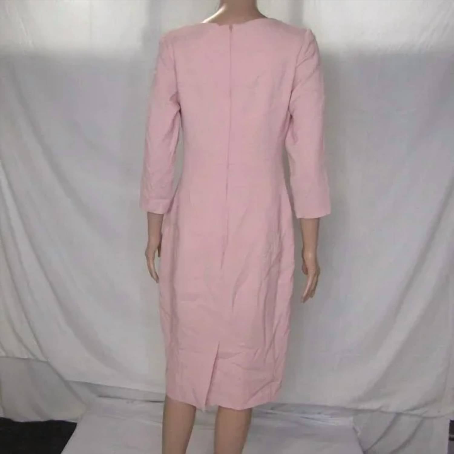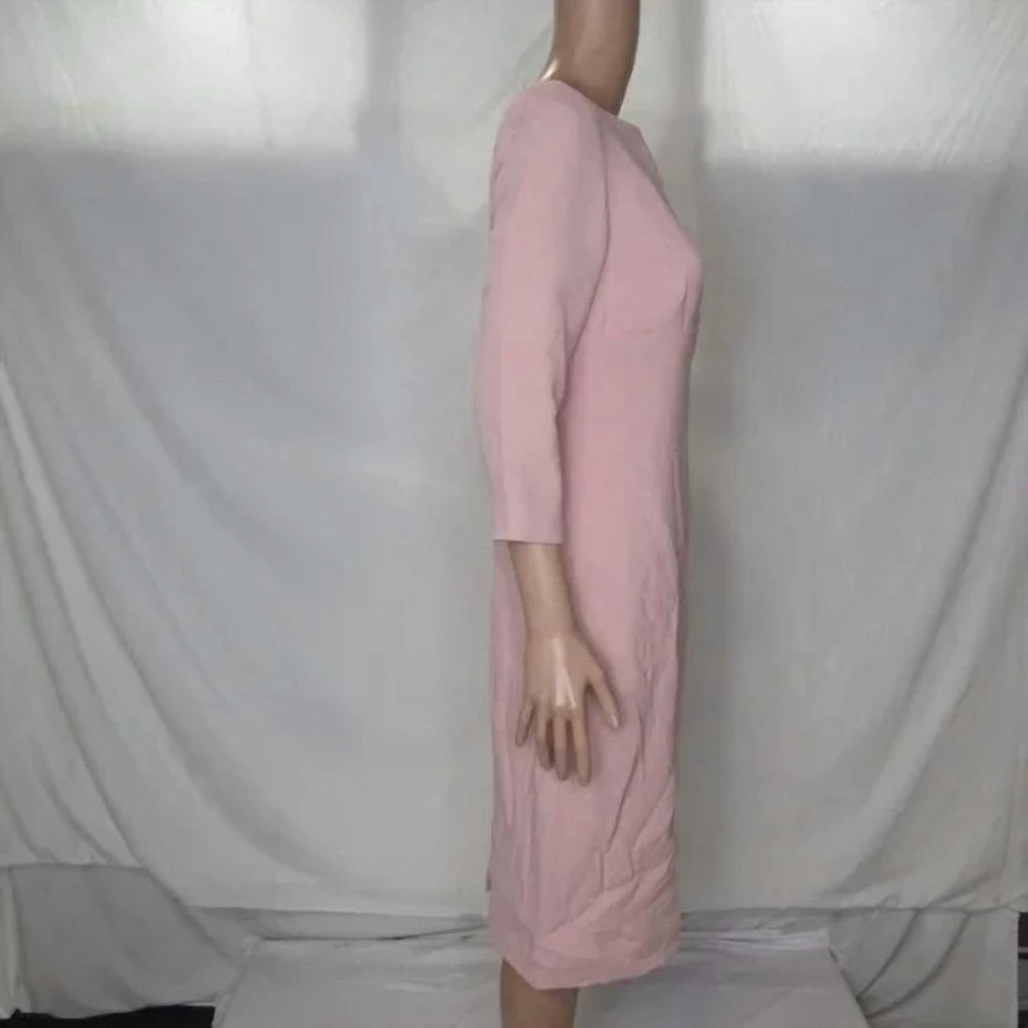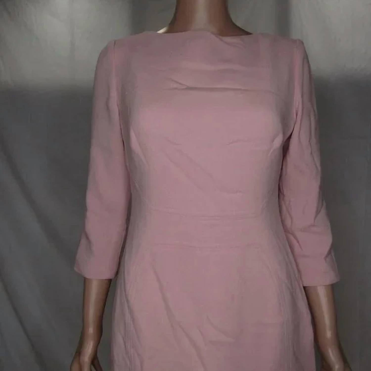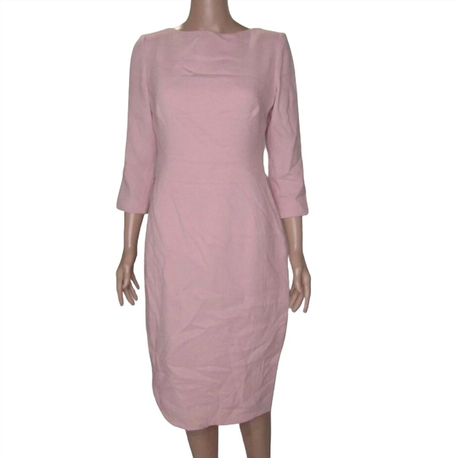 The perfect length dress does exist. Elevate your workwear wardrobe with the Women's Wool Crepe Half Sleeve Midi Shift Dress by Lela Rose, crafted in luxurious pink wool blend. This solid-color midi dress features a sleek boatneck and elegant three-quarter sleeves that exude sophistication. Made in the US, it is designed with a convenient zip closure for ease of wear. Care: Dry clean only.