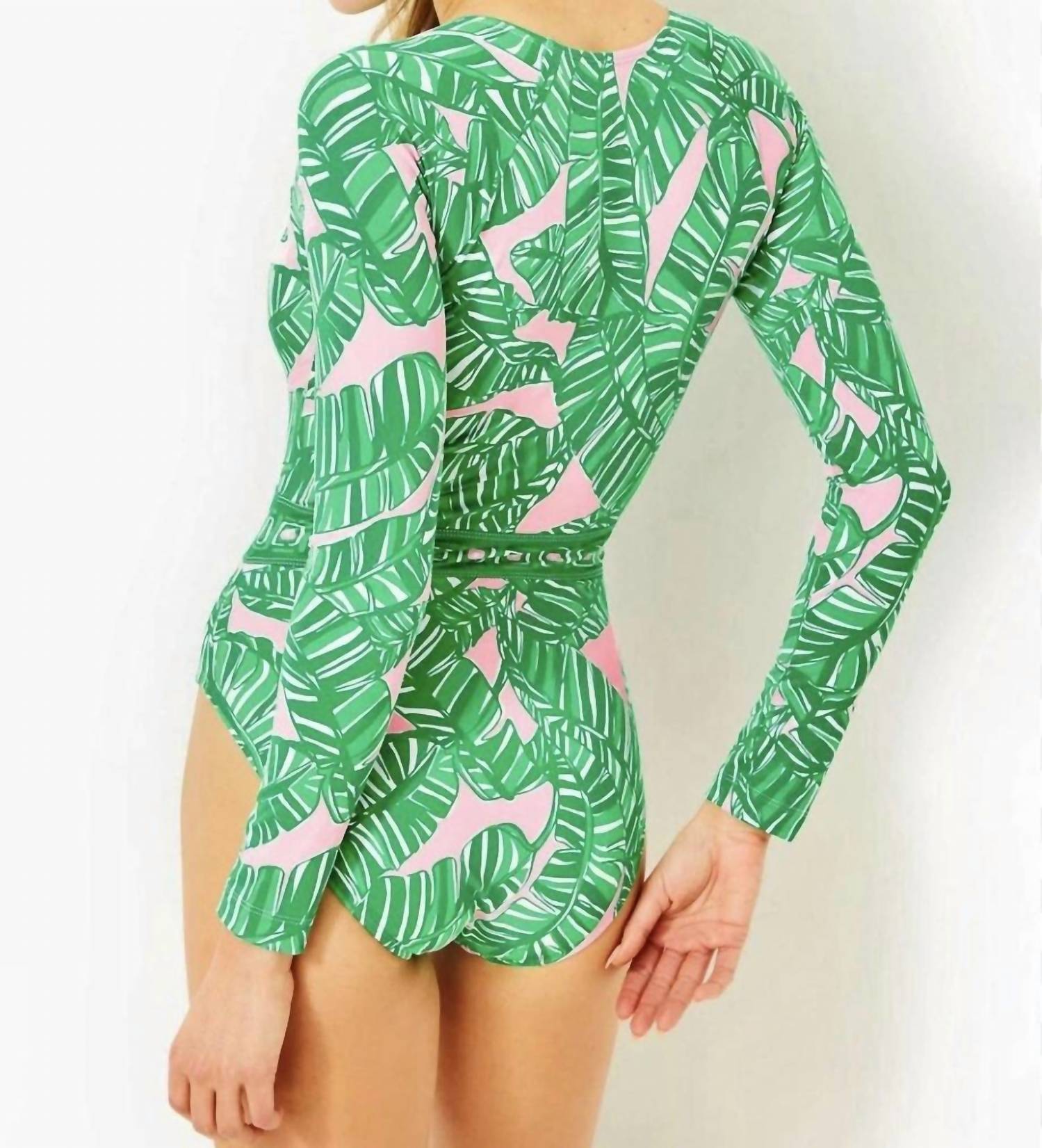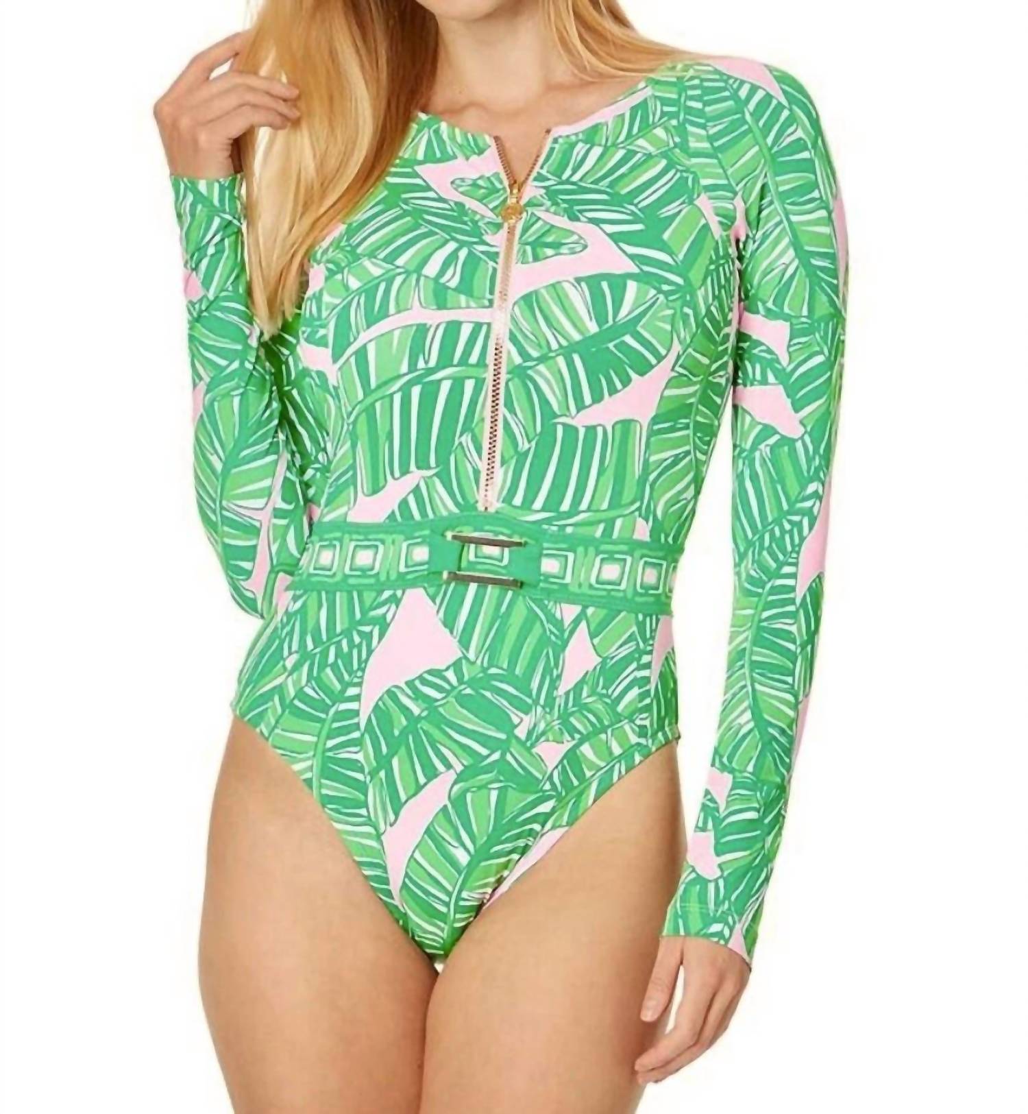 Designed to perfection and fit to flatter. You are going to love this one piece swimsuit. Stay stylish and protected with the Toretta Rashguard One-piece Swimsuit by Lilly Pulitzer, featuring long sleeves and a chic gold zipper and buckle detail at the center front. This swimsuit, in a vibrant green/pink patterned design, offers full coverage and incorporates UPF 50+ sun protection, along with engineering at the waist for a flattering fit. Made from a nylon spandex knit blend (75% Nylon, 25% Spandex), it includes removable cups and is fully lined. Care instructions recommend hand washing in cold water and line drying out of direct sunlight.
