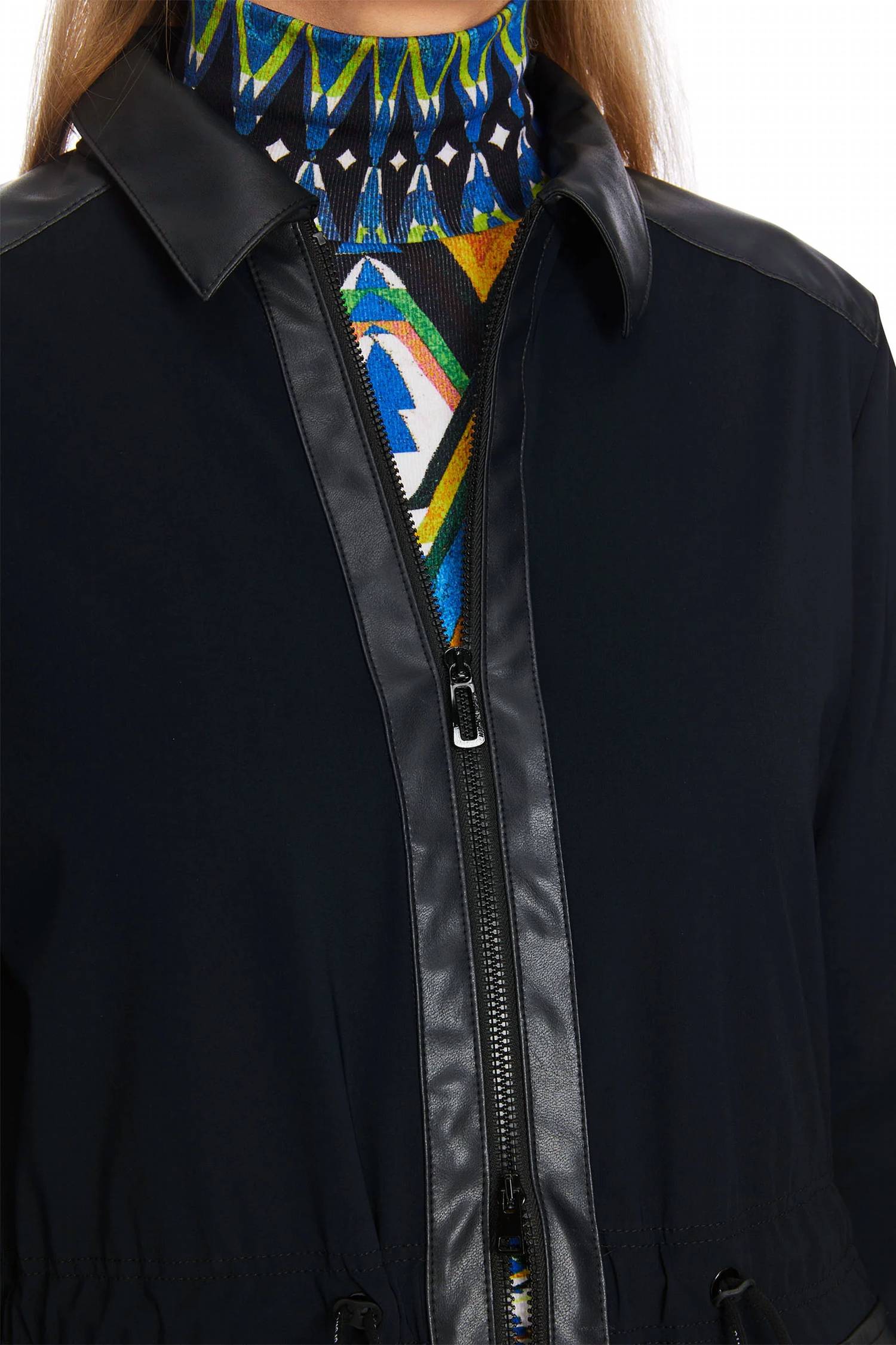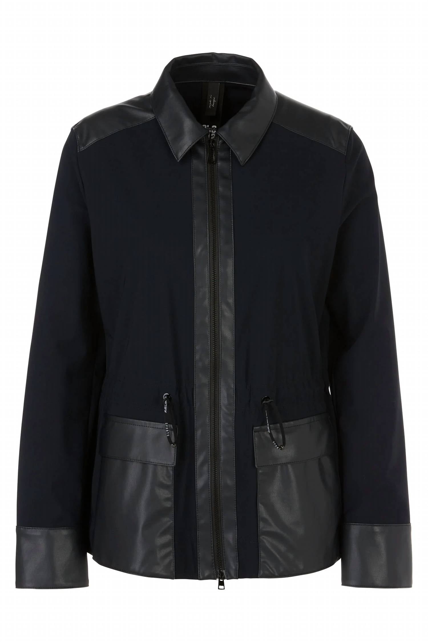 The coolest, most versatile utility jacket. Match it with your favorite pair of denim or throw it over any day dress. Introducing the Sports Mixed Fabric Shirt Jacket by Marc Cain, a stylish utility jacket in navy designed for the modern woman. This long sleeve jacket combines soft jersey with matte and shiny fungal leather accents for a sophisticated look. Composition: Jacket is made from 68% Polyamide, 32% Elastane with a polyurethane-coated trim, including 60% recycled polyamide. Enjoy the convenience of a two-way zip closure and practical pockets. Care: Machine wash and line dry for easy maintenance, perfect for your winter travel wardrobe.