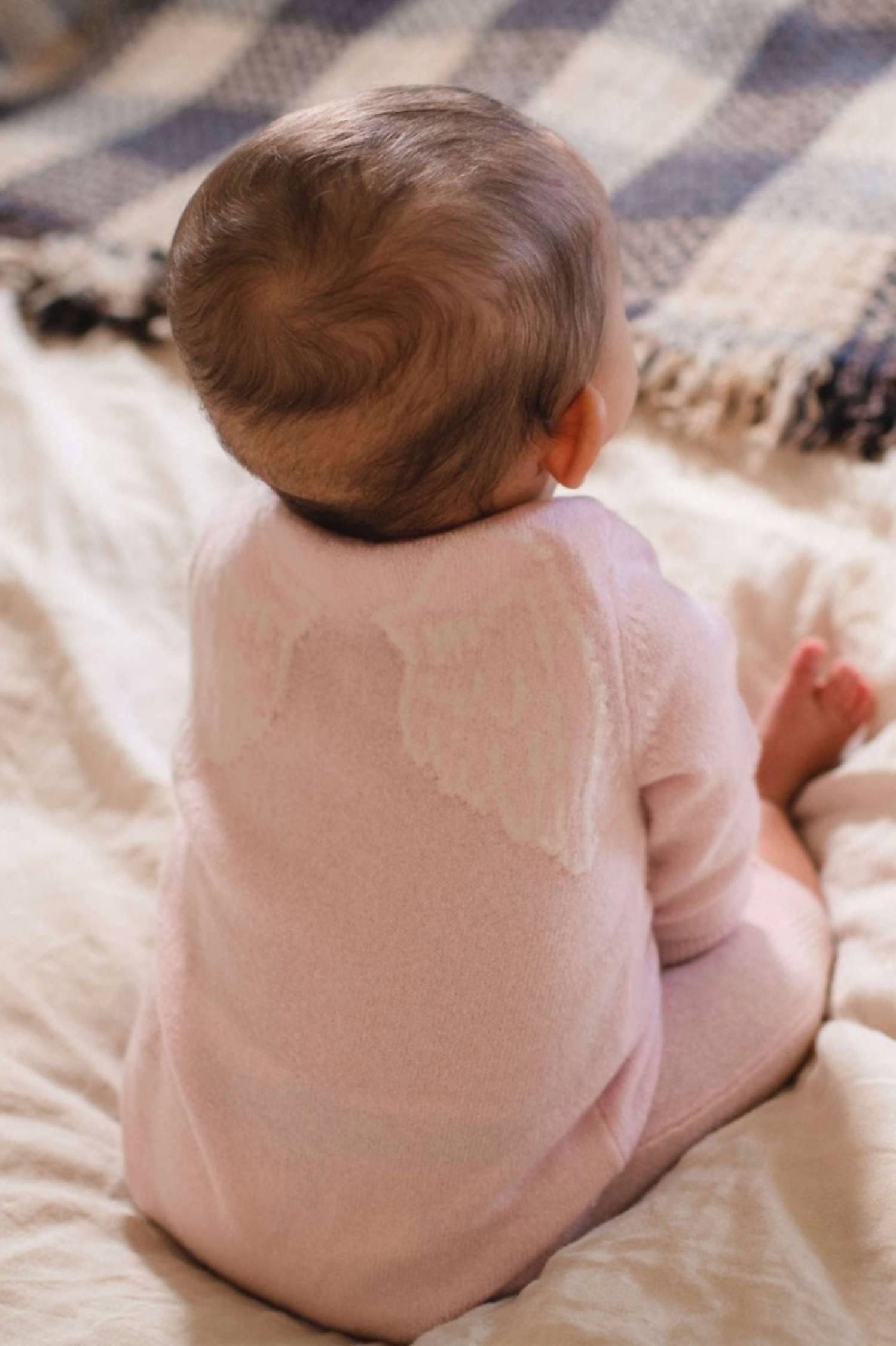 The Baby Angel Onesie by MIKA & MILO, crafted in a soft cashmere blend, wraps your little one in cozy warmth while ensuring breathability. This patterned blush bodysuit features whimsical angel wings, knitted using the traditional Intarsia technique for crisp detailing. Thoughtful buttons at the shoulder and down the legs make changing a breeze. Awarded 5x Junior Design Award, it is loved by parents for its eco-conscious craftsmanship. Care instructions: Hand wash.