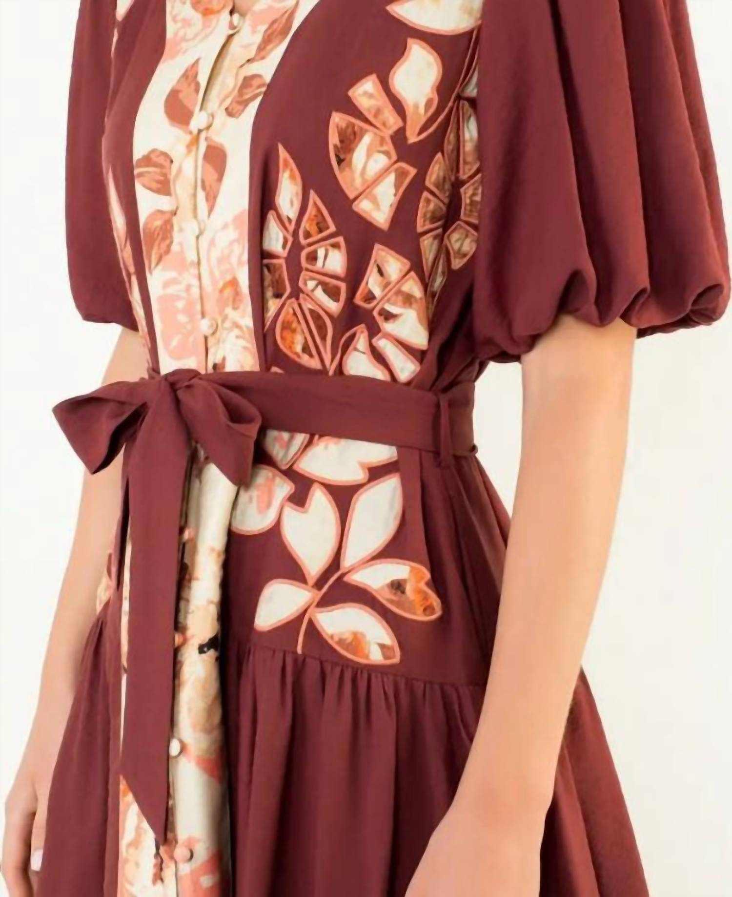 Perfectly tailored and soft to the touch. Embrace the charm of the season with the Micah Puff Sleeve Button Up Dress by Mint. This dress flaunts short puffed sleeves and a flattering self-tie waist belt, all enveloped in elegant burgundy florals. The mini-length silhouette features a ruffled detail at the hem, perfect for a holiday party. Its V-neckline adds a touch of sophistication, making it an exquisite choice for any occasion.