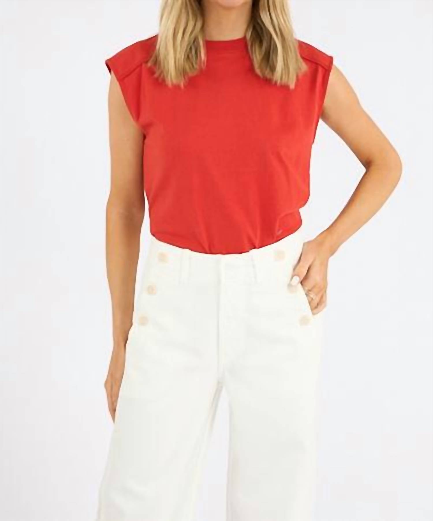 This muscle tee isn't just for the gym. Pair it with your favorite jeans for the perfect casual-cool vibe. Introducing the Perry Muscle Tank by Nation LTD, a perfect minimalist piece in vibrant Aurora Red. This women's top features cap sleeves and a crewneck, crafted from breathable organic cotton for comfort. Designed with a trendy boxy silhouette, this muscle tee offers a relaxed fit with shoulder piping and a yoked bodice. Closure: Pull on. Ideal for vacation wear and versatile enough to complement your summer wardrobe.