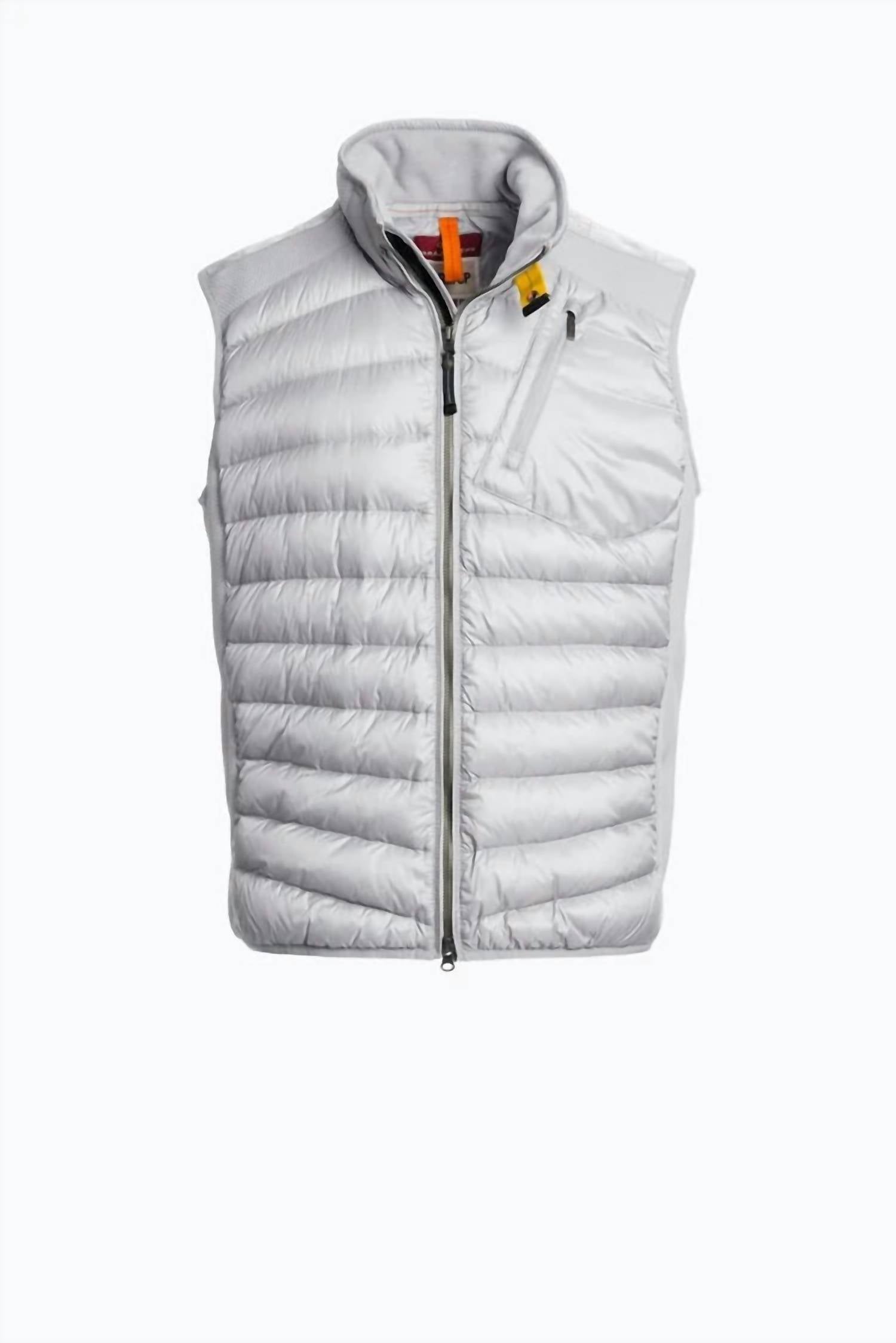 Introducing the Men's Xavier Hybrid Vest by PARAJUMPERS in Lunar Rock, an essential for your winter wardrobe. This sleeveless vest is crafted from 100% polyamide with recycled 20 den nylon taffeta and a semi-shiny finish. It features a practical zip closure with three front pockets, a back zippered pocket, and two inner pockets secured with velcro, making it perfect for a minimalist look at a dinner party. Care for this piece by machine washing and laying it flat to dry.