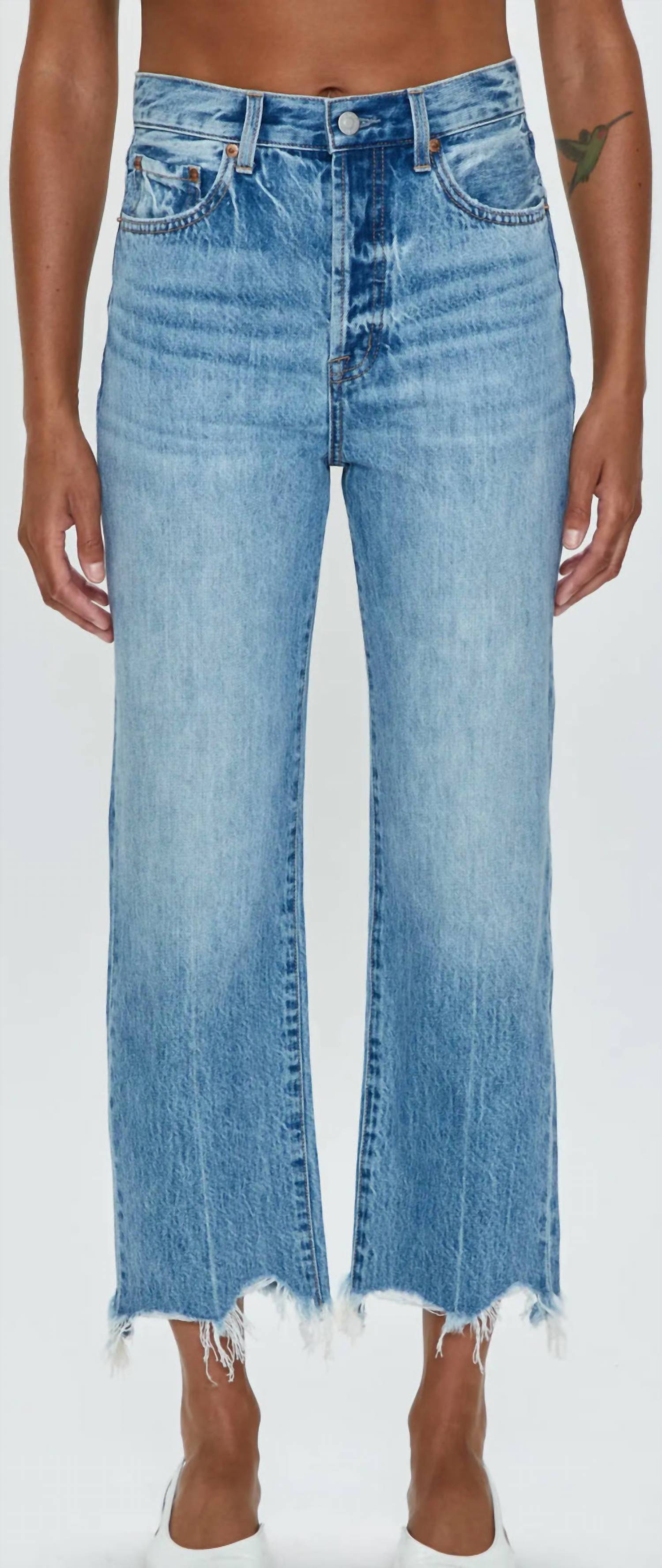 High-waist is here to stay and we especially love this style. Discover the Cassie Crop Super High Rise Straight Jeans by Pistola, the quintessential summer denim wardrobe essential for a preppy look. Crafted from 100% cotton, these women's jeans feature a relaxed fit with a medium wash and a high waist for added style. They boast a sparingly distressed design with dimensions including a 25 1/2" inseam, 17" leg opening, 12 1/2" front rise, and 14 1/2" back rise, available in a solid blue color. Closure: Button closure. Care: Machine wash and tumble dry.