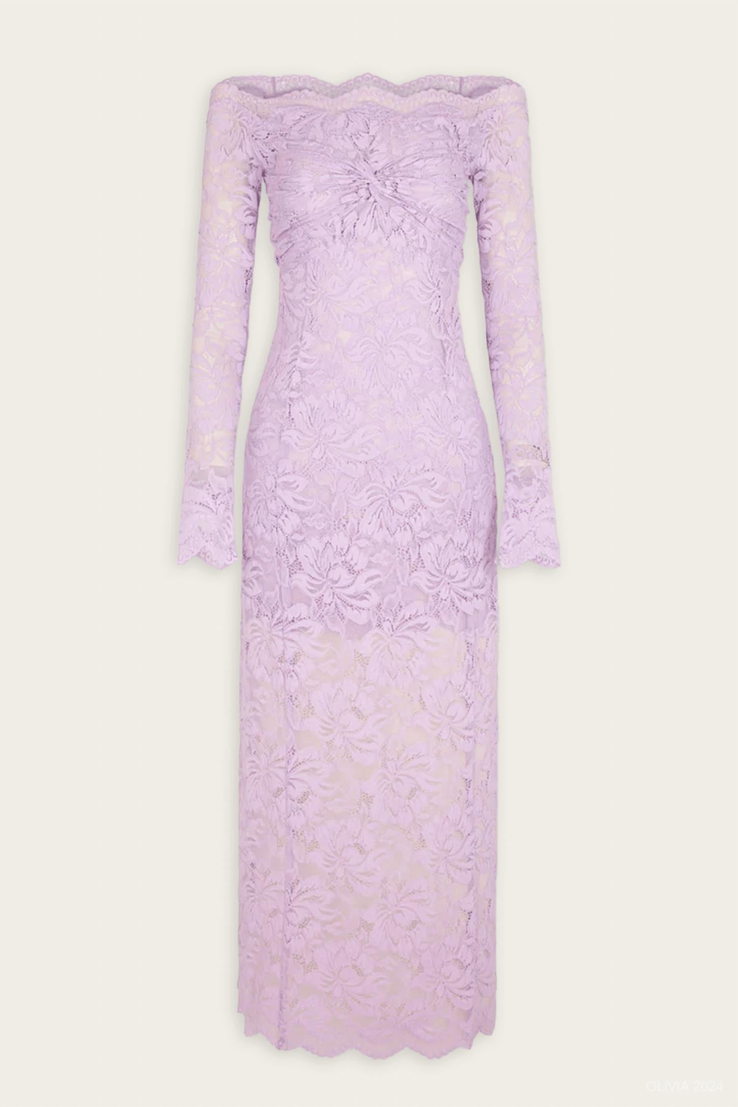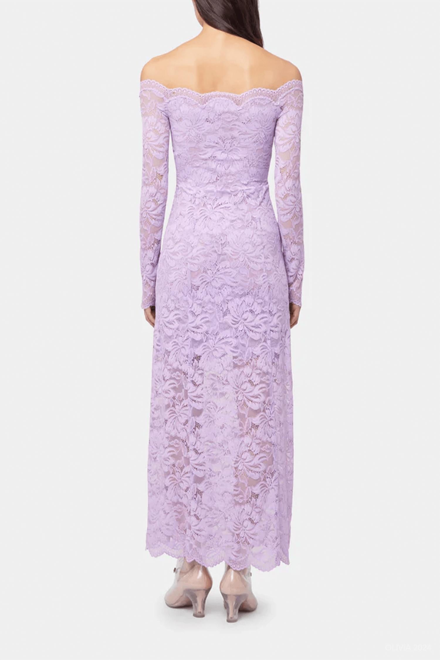 A flattering yet comfortable dress you'll be reaching for season after season. Introducing the Lace Off-Shoulder Midi Dress by Rabanne, a stunning piece in French Lavender perfect for concerts and special occasions. This dress boasts long sleeves and an off-the-shoulder neckline, crafted from a blend of 90% polyamide and 10% elastane for a comfortable, stretchy fit. Made in Tunisia, this sheath silhouette dress features a cinched waist for a flattering look. It is designed with a pull on closure and should be hand washed and laid flat to dry.