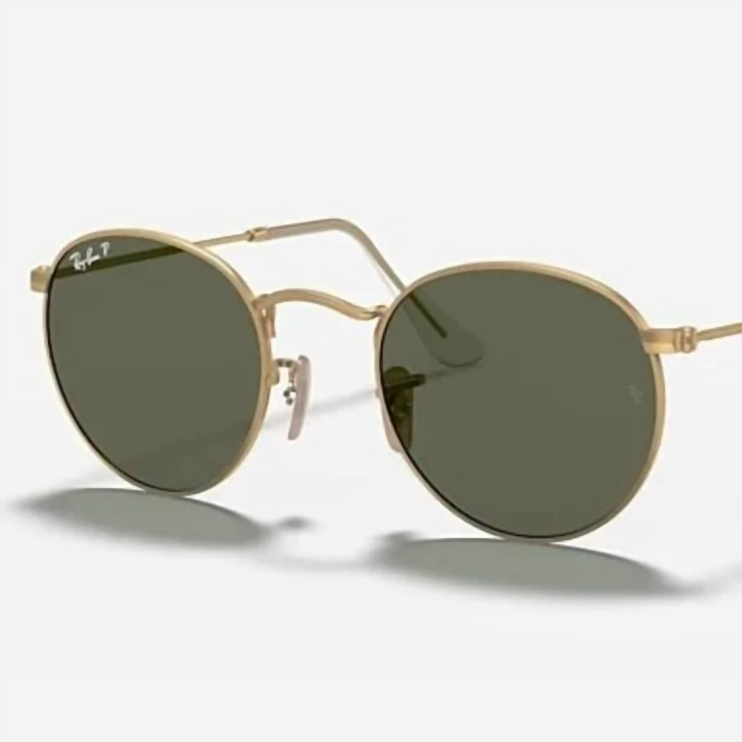 Make a statement and shield your eyes in these fashionable, yet practical sunglasses. Grab these adorable shades for your next vacation and elevate your accessory game. Embrace a vintage aesthetic with the Women's Round Metal Sunglasses by Ray-Ban, model RB3447 112/58, crafted from matte gold metal with a minimalist profile that harks back to the iconic 1960s. These round sunglasses feature G-15 green lenses offering sharp, high-contrast vision and 100% UV protection, perfect for those with narrow face shapes seeking chic style and functionality. Lens dimensions are a precise 50mm width and 46.9mm height, complemented by a bridge width of 21mm and a temple length of 145mm. Equipped with adjustable nose pads for a custom fit, each pair includes an original Ray-Ban case and cleaning cloth, ensuring easy maintenance and storage.