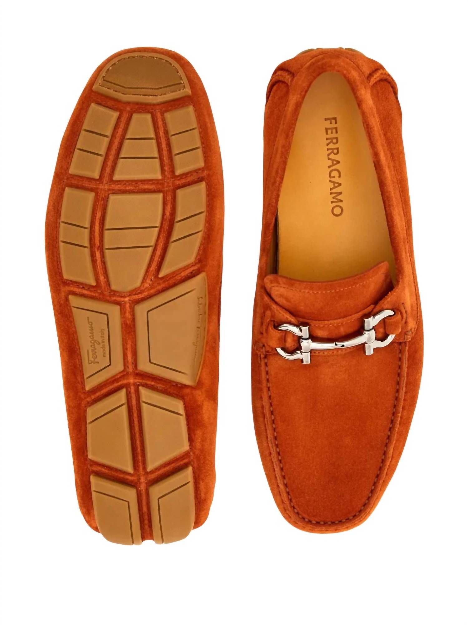 Step into elegance with Salvatore Ferragamo's Men's Gancini Suede Driving Shoes. These Italian-crafted loafers showcase a luxurious terracotta orange calfskin suede outer with a sleek slip-on style and a distinctive Gancini plaque. The shoes feature a flat rubber sole and a squared toe, complemented by a branded leather insole and silver-tone hardware for a minimalist look perfect for dinner parties or New Year's Eve celebrations. Composition: 100% Calfskin outer and lining. Designed for the modern man who values both style and comfort.