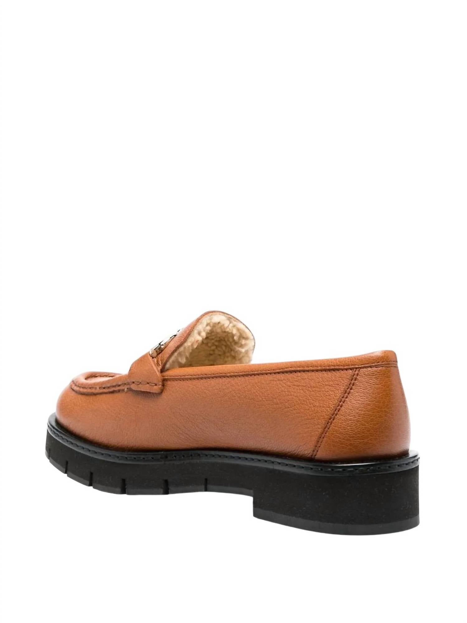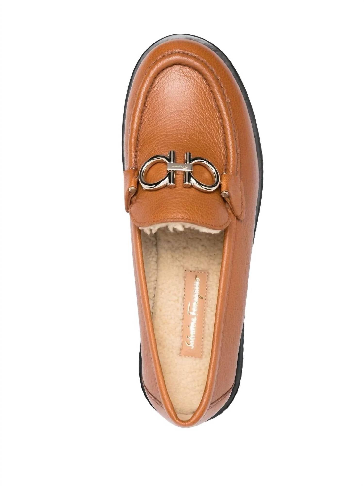 Loafers so versatile you can wear them with just about anything. Step into luxury with the Women's Rolo Shearling-lined Loafers by Salvatore Ferragamo, crafted in Italy. These brown loafers feature an outer composition of 100% goat skin leather and a comfortable shearling lining made from 100% Merino wool. Boasting a flat heel style with a low heel height of 1 1/4" to 2", these loafers provide both elegance and comfort for any occasion, from a dinner party to a New Year's Eve celebration. The round toe design and rubber sole ensure perfect style and durability, aligned with the trend of quiet luxury for the spring season.