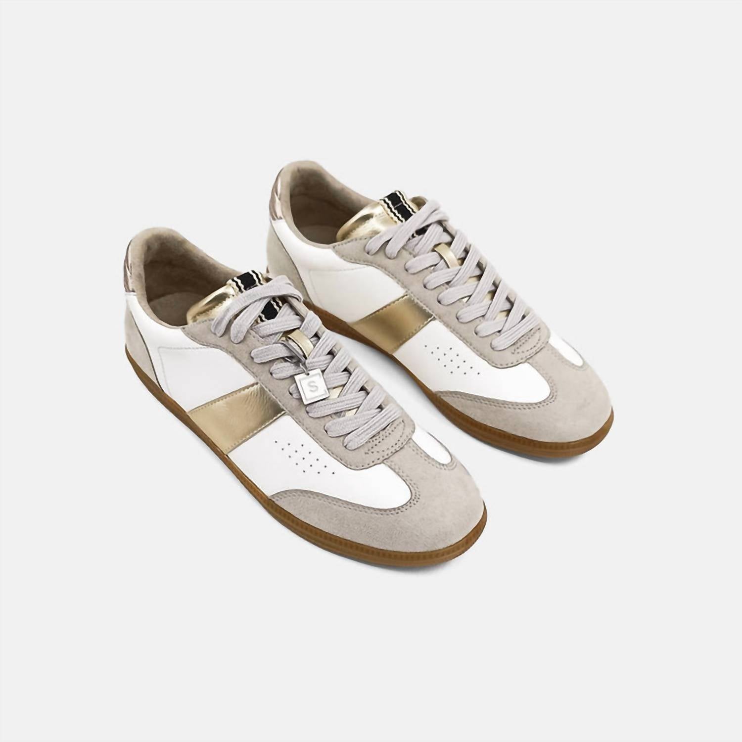 When fashion and function come together seamlessly. Step into retro style with the Women's Sydney Sneaker by SHU SHOP, featuring a low-top silhouette that masterfully merges vintage appeal with contemporary trends. Crafted from white faux leather and suede uppers, it boasts a striking gold metallic color combination. The camel-colored rubber soles ensure both style and comfort. Perfectly accentuated with a modern pendant tag, this statement piece is designed for the trendsetting woman.