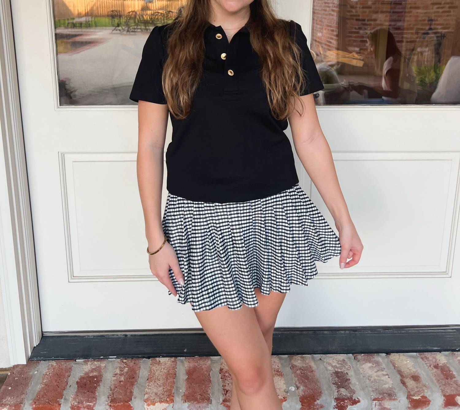 The Reagan Set by SMITH & QUINN combines a charming pleated skort in a classic French gingham print with a sleek black polo adorned with brass buttons for a sophisticated touch. Made from S&Q Signature Italian Matte Stretch fabric, this ensemble offers a flattering fit and modern silhouette. Closure: Pull on. Perfect for vacation wear, this set embodies the essence of summer streetwear style. Model is wearing a size XS.