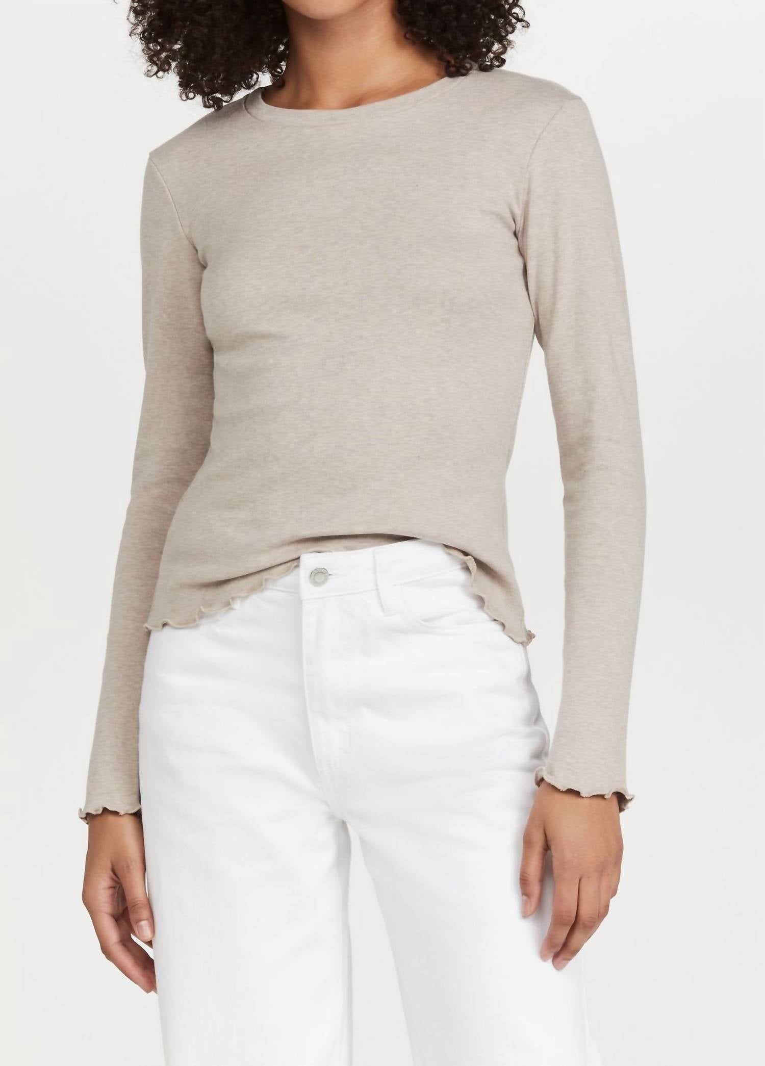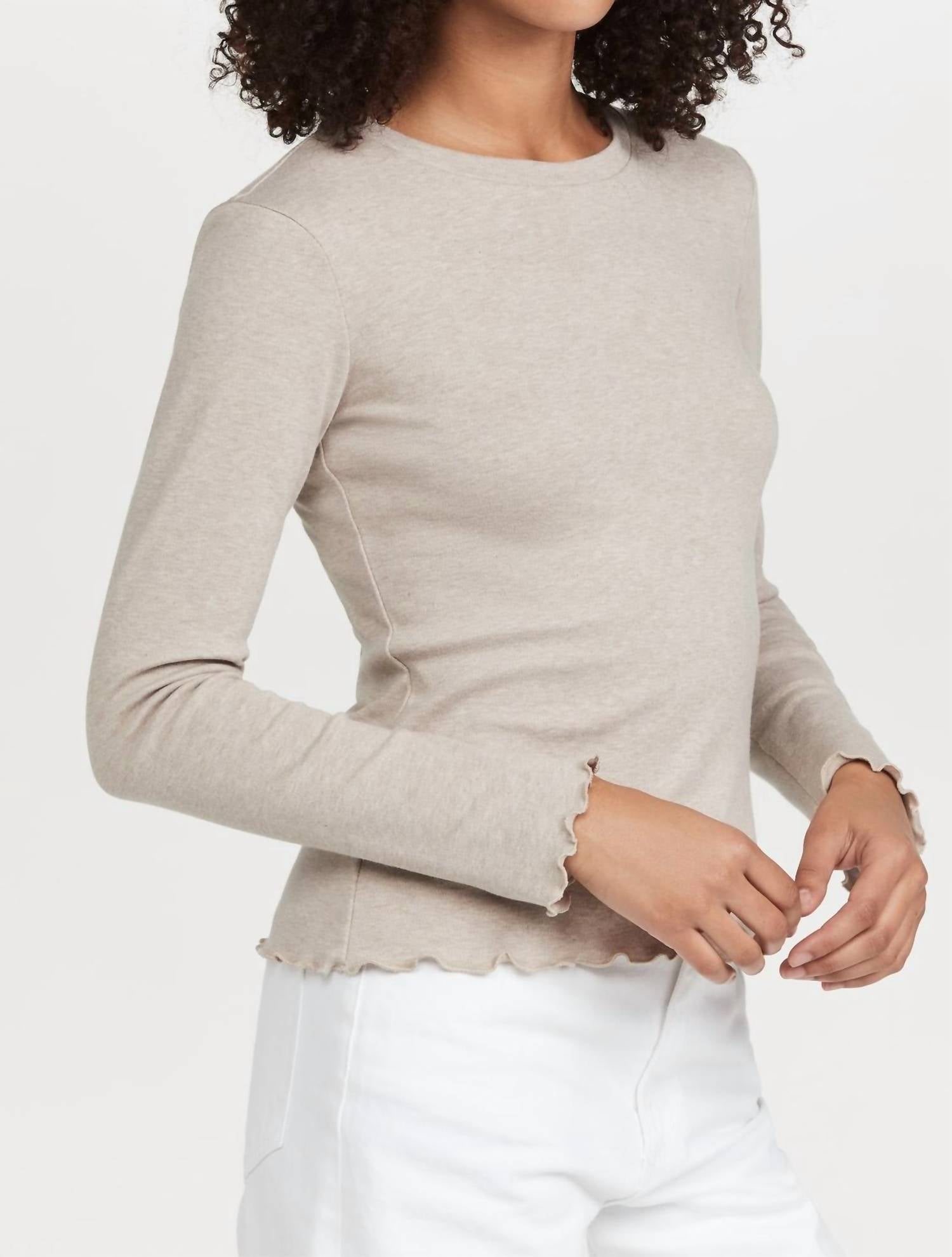 The perfect long sleeve tee that goes with just about anything. Introducing the Long Sleeve Lettuce Edge Top by SOMETHING NAVY, an elegant addition in serene oatmeal, perfect for any dinner party or spring gathering. Crafted from 100% lightweight cotton jersey, it showcases a charming lettuce-edge trim. The pull-on style with a crew neck and long sleeves offers a minimalist appeal. Made in Italy, this top is machine washable, ensuring you can lay it flat to dry for easy care.