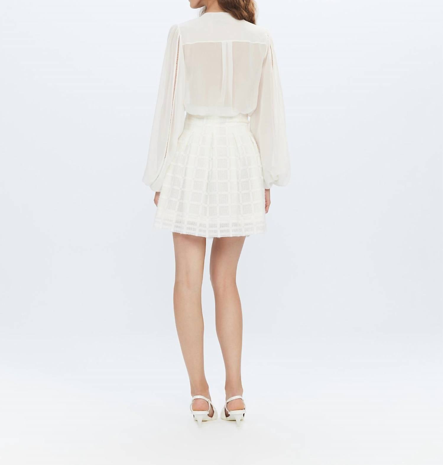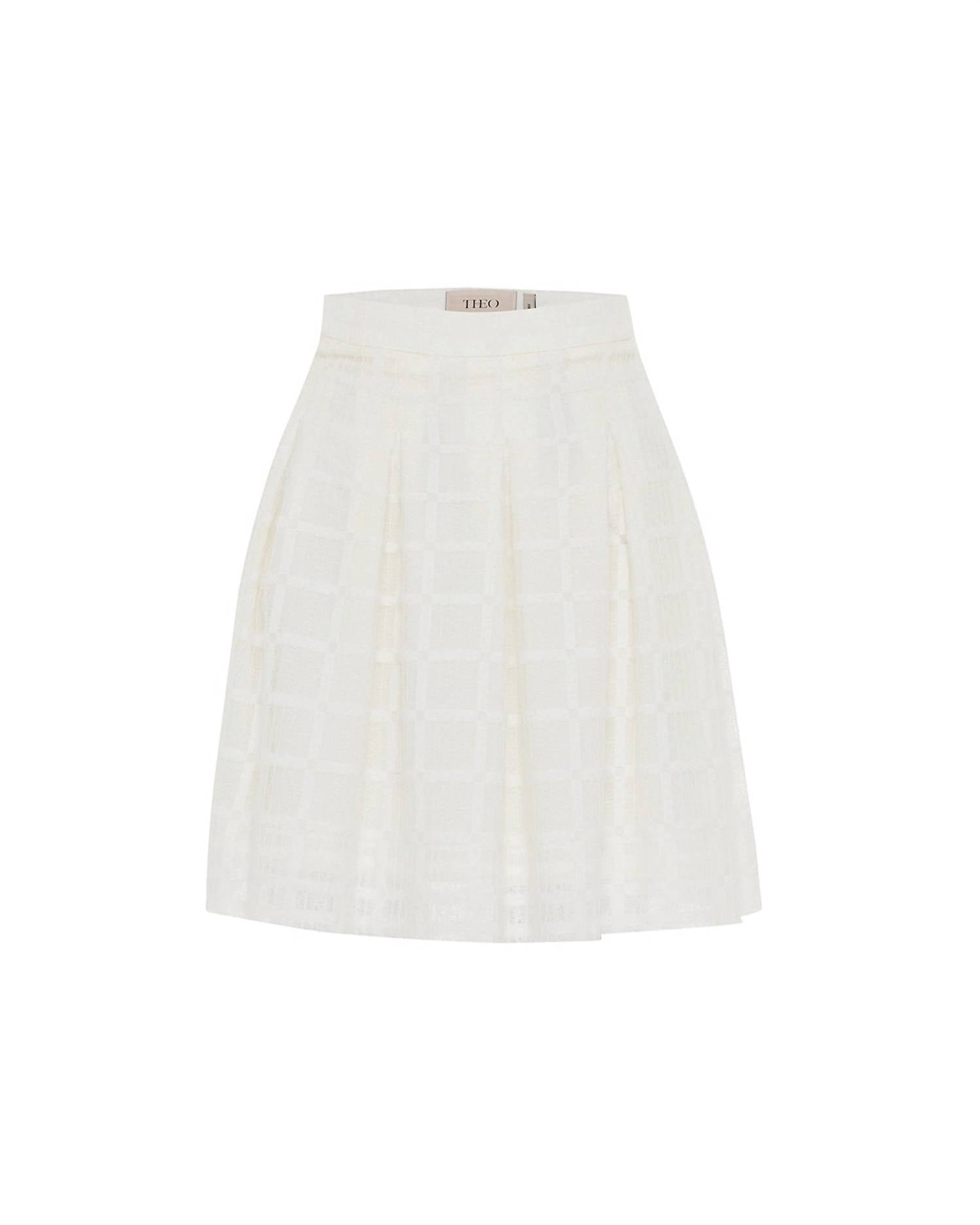 Show just the right amount of leg in this fit flattering mini. Elevate your ensemble with the Atropos Windowpane Lace Banker Skirt by THEO the Label, a chic mini crafted in textured polyamide for refined elegance. This ivory skirt features delicate pleating in a windowpane pattern and is tailored for a sleek fit with a convenient side zipper. Designed for women looking to make a statement at your next holiday party, it offers versatility to be worn as a set or styled separately. Care instructions recommend dry cleaning to preserve its intricate detailing.
