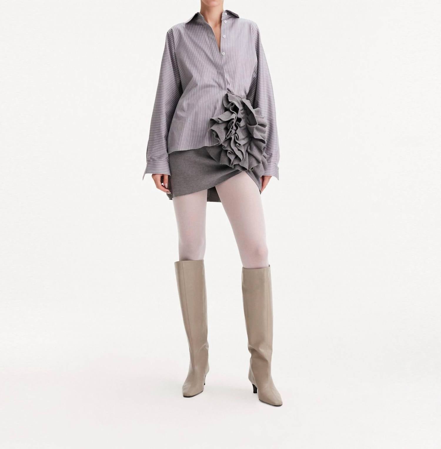 A classic button down shirt that will never go out of style. Introducing the Echo Back Button Dolman Shirt by THEO the Label, a striking addition to any wardrobe. This grey and white striped piece is crafted from high-end cotton, offering a relaxed dolman silhouette with long raglan sleeves for a contemporary edge. Its standout feature is the convertible back button detail that effortlessly switches up your look. Closure is seamless with button closure, and it's intended for sophisticated events such as holiday parties this spring. Care: Dry clean only.