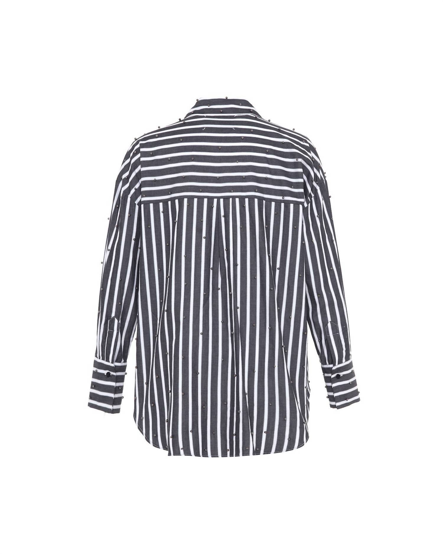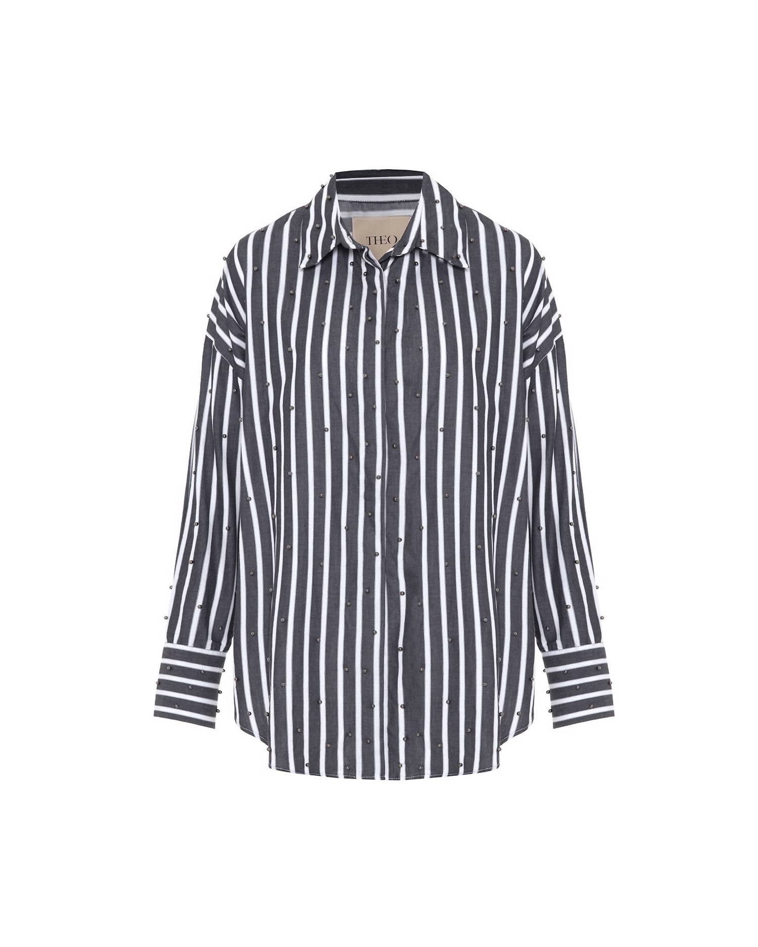 This button down shirt is comfortable yet polished. Elevate your wardrobe with the Women's Echo Pearly Shirt by THEO the Label, a chic addition in Black/Gunmetal for holiday parties. This button-down shirt showcases long sleeves and a classic collar, focusing on its unique stripe pattern embellished with delicate pearls. Expertly crafted from a Cotton Blend, this piece ensures both comfort and style. Closure: Button closure. Care: Dry clean only.