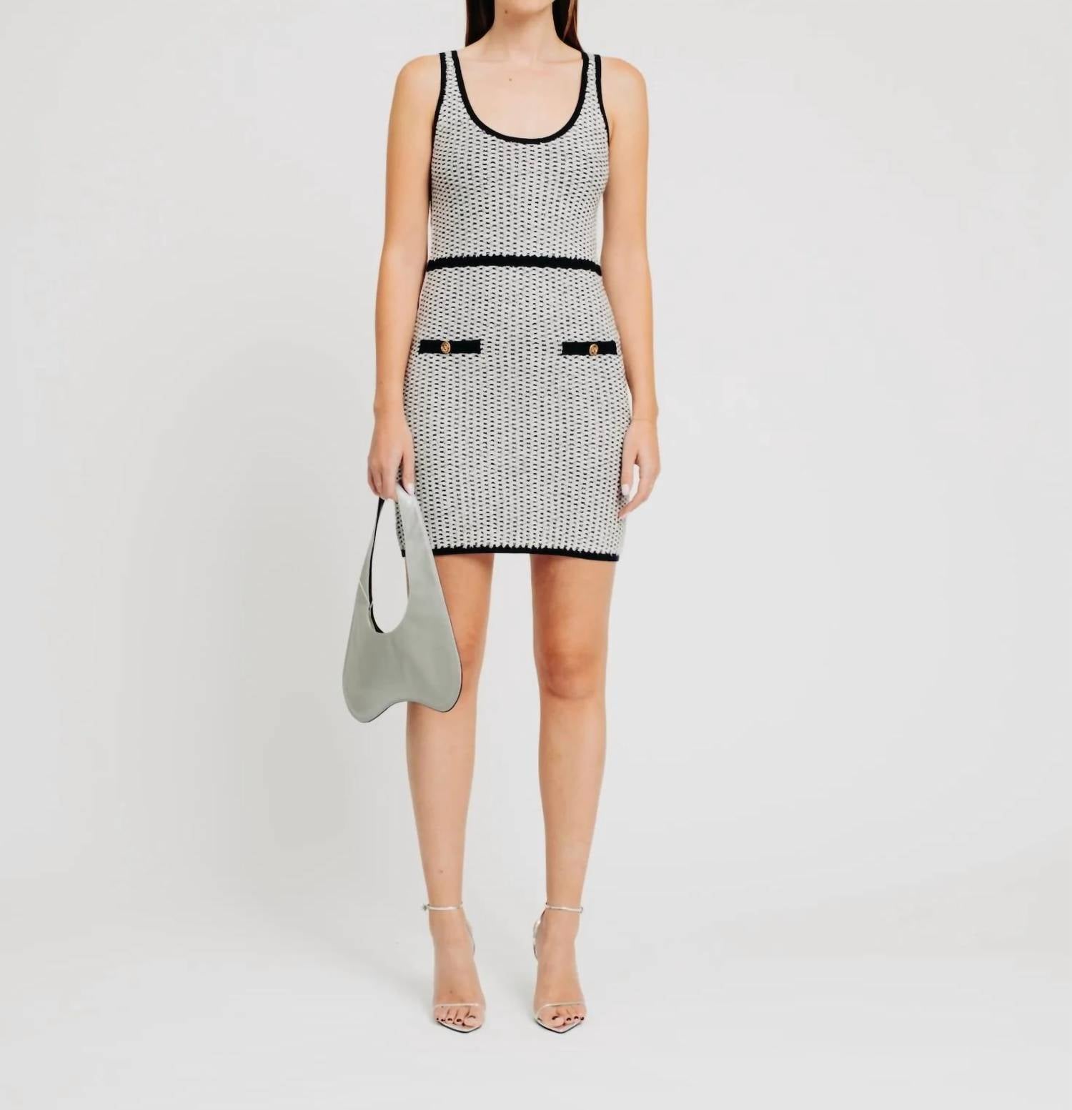 The kind of easy and flattering dress you'll be reaching for all season long. Introducing the Lyra Mini Dress by Torn by Ronny Kobo, a sleeveless masterpiece perfect for a minimalist spring look. Crafted from textured boucle knit tweed, this black and white dress features a stylish scoop neckline and a figure-enhancing waistband detail. The dress is patterned and designed for a chic dinner party, boasting two faux welt pockets with buttons at the front. It offers a pull-on closure and is best cared for by hand washing and laying flat to dry.