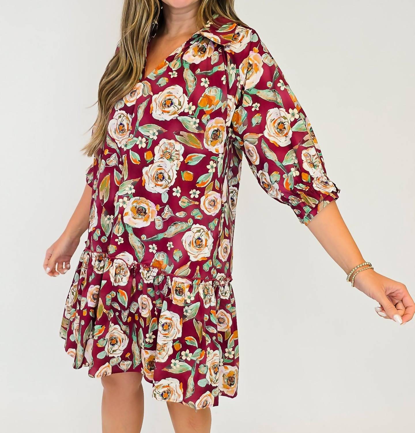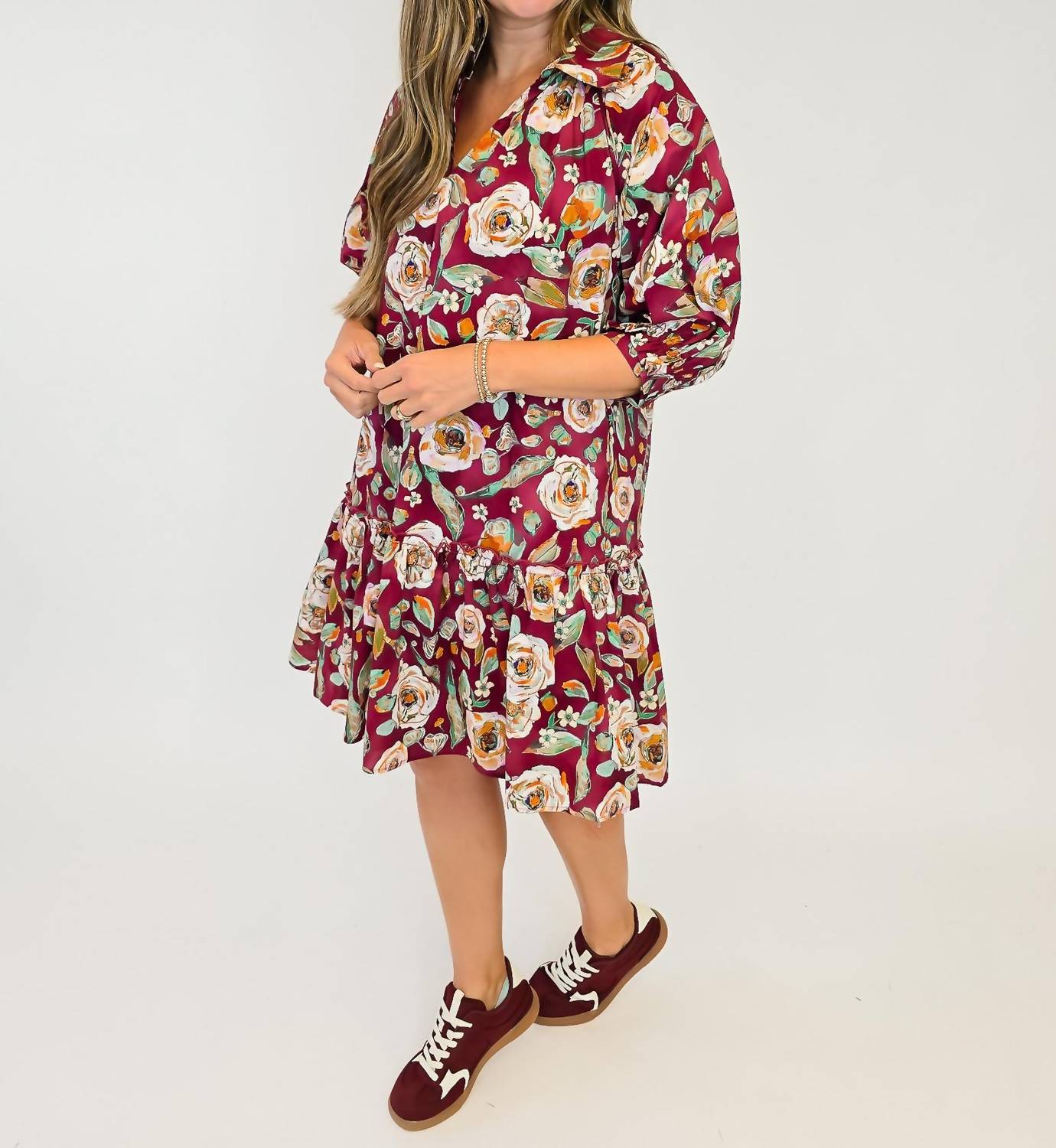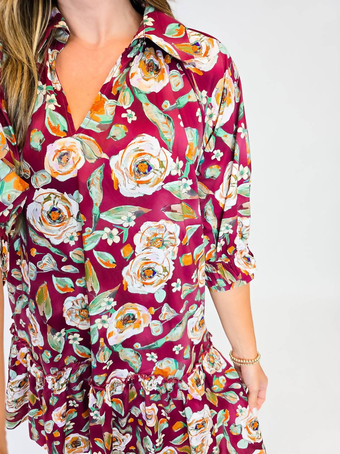 A short and breezy dress for those warmer days. Introducing the Floral Drop Waist Shirt Dress by Umgee, a charming piece in Burgundy that exudes vintage allure with its camellia print. Featuring three-quarter sleeves with gathered cuffs and a collared V-neckline, this dress offers a relaxed, flowy fit perfect for a boho chic summer look. Composition: 100% Cotton. Closure: Button closure. Back length of 35". Care: Machine wash cold, do not bleach, hang to dry. Available in sizes Small, Medium, and Large.