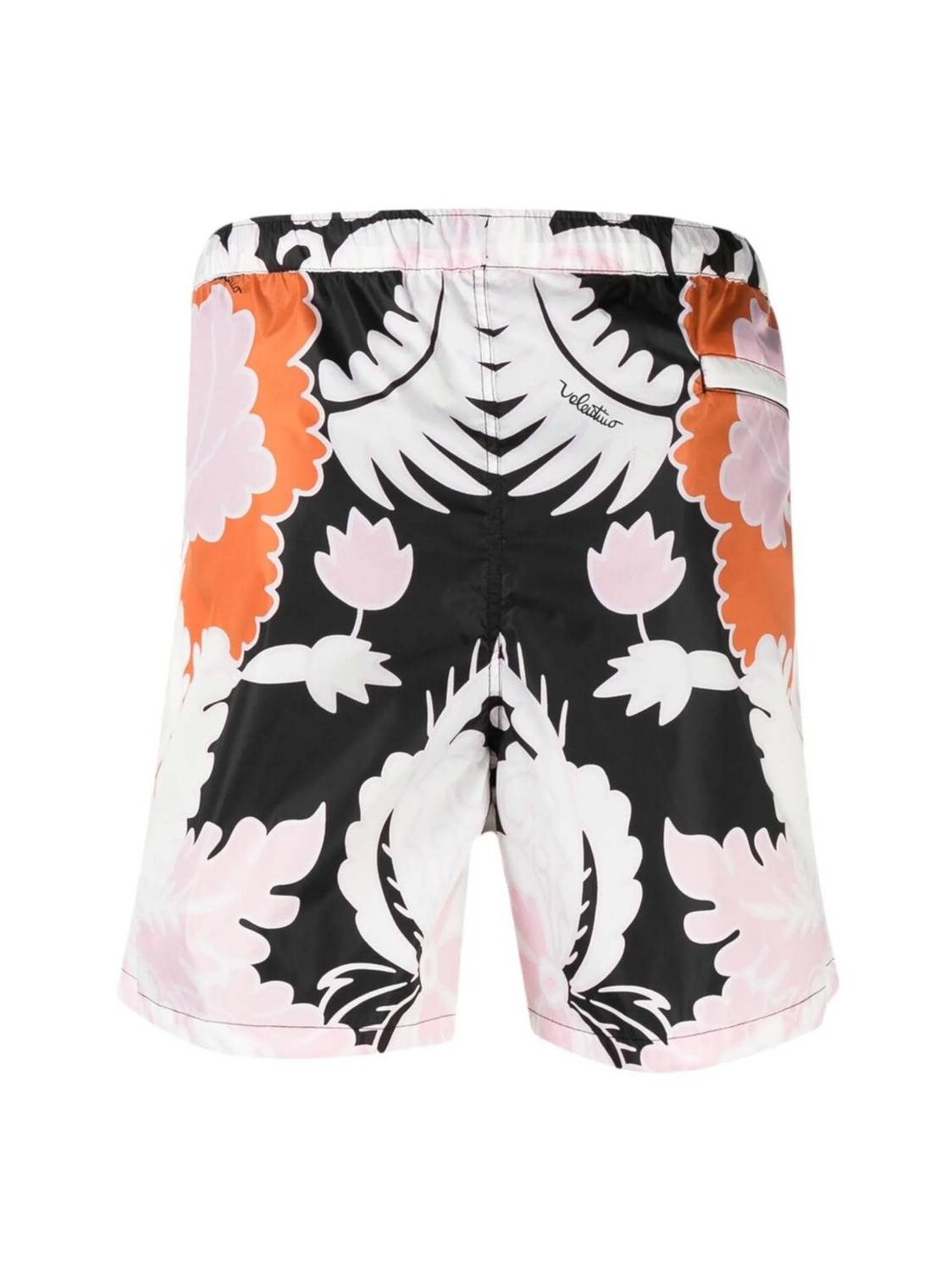 Dive into style with the Men's Arazzo Print Swim Shorts by Valentino, featuring a striking black and rose colorway. These swim bottoms showcase contrast stitching and come with an elastic waistband for comfort, alongside two side pockets and two back patch pockets for functionality. Crafted in Italy from 100% polyamide, these shorts promise durability and a perfect fit. They are lined for full coverage, and designed for beach day occasions. Hand wash.