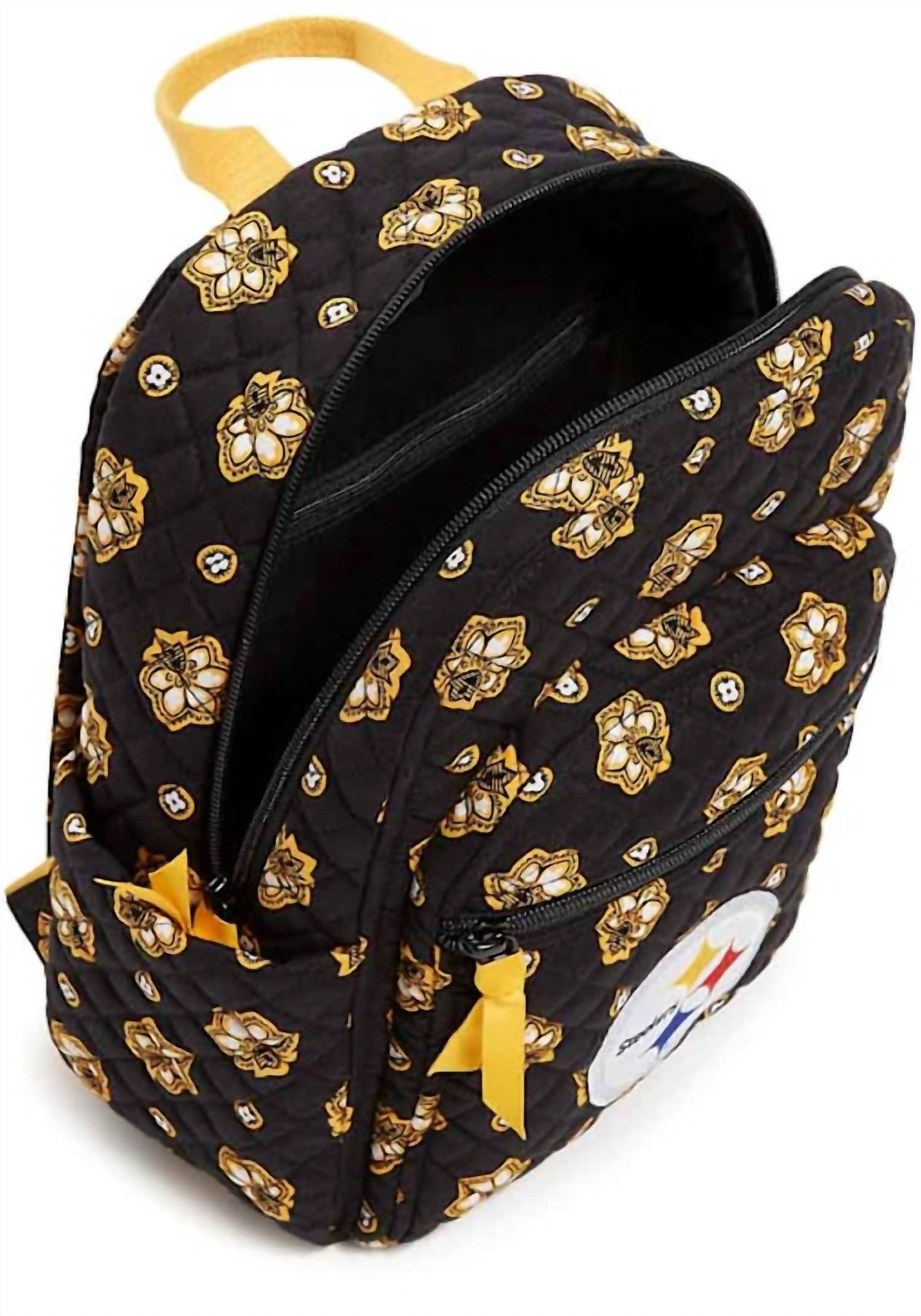 Not only functional, this backpack is stylish and fits everything you need in one place. It's a win-win! Show off your team spirit with the Women's Pittsburgh Steelers Small Backpack by Vera Bradley, crafted from recycled cotton in classic black. This compact design features a spacious interior with a zip pocket, while the exterior boasts a zip pocket and two side slip pockets for easy access. With zip closures and a 9-liter capacity, it's perfect for everyday use. Dimensions: 9.0" width x 12.0" height x 4.75" depth, with a 2.75" handle drop.