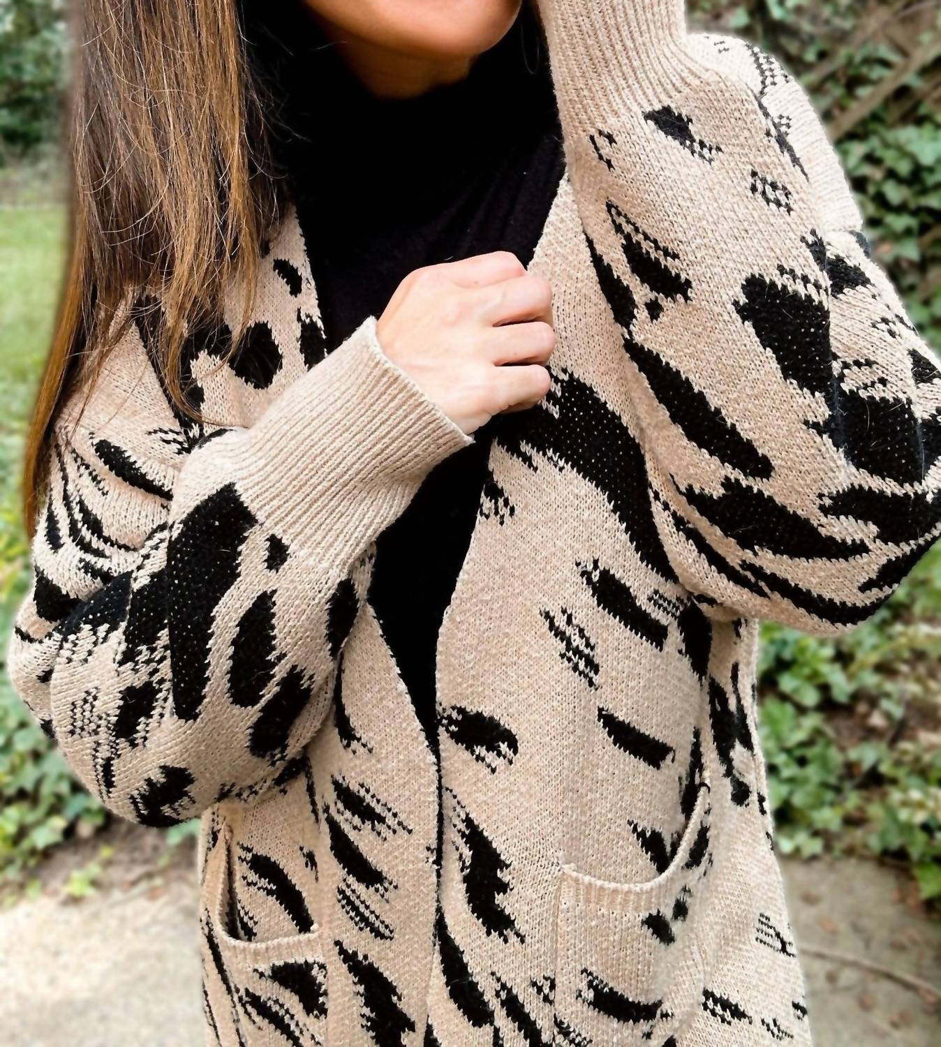Throw this adorable cardigan over any cami or tank top. Introducing the Harper Heavyweight Animal Print Cardigan by With Love, Molly—a must-have staple for your closet. This cardigan features long sleeves and a v-neck in a trendy abstract animal print that is both modern and fashion-forward. Made from designer-quality pre-shrunk wool, it offers a flattering long length and oversized fit in a chic beige color. Perfect for any occasion, this heavyweight piece is a versatile option that you'll cherish for years.