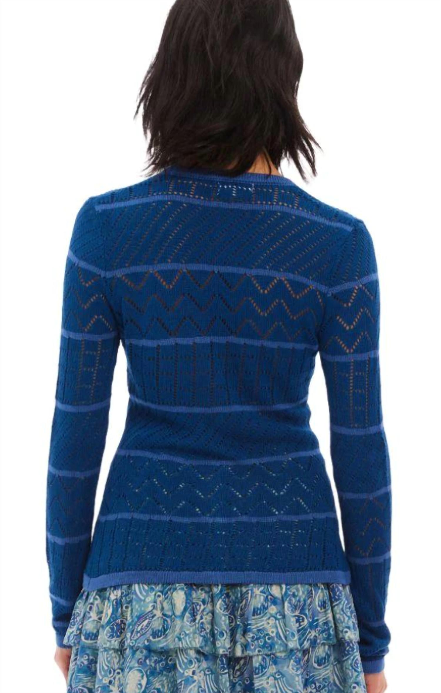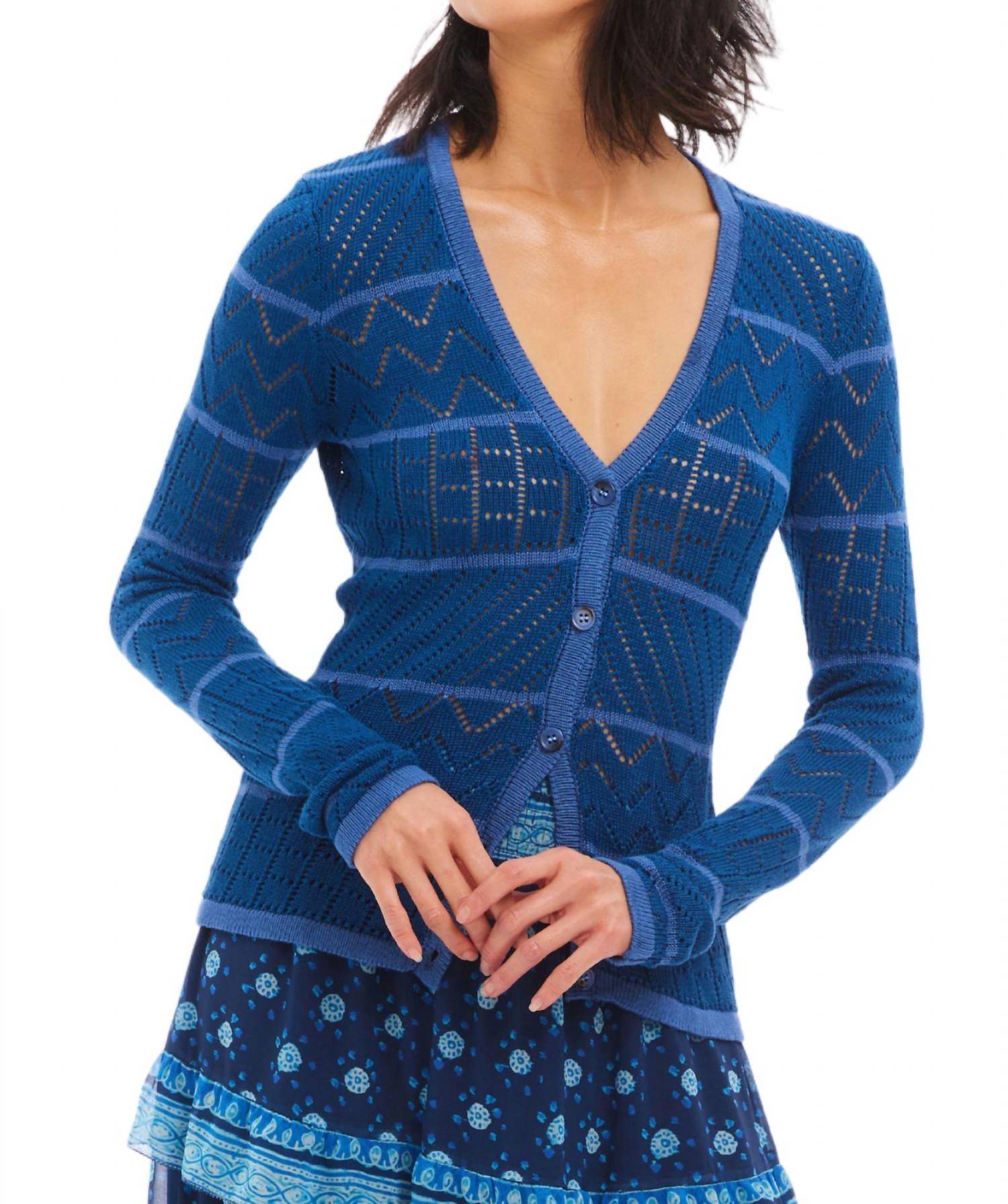 Elevate your wardrobe with the Gloria Cardigan by Allison New York, an essential piece perfect for transitioning seasons. This navy knit cardi features a fitted design with a flattering V-neck and long sleeves. Crafted from 100% viscose, it has a chic button front closure and measures 20.5 inches in length. Care for it with dry clean only instructions to maintain its pattern and shape.