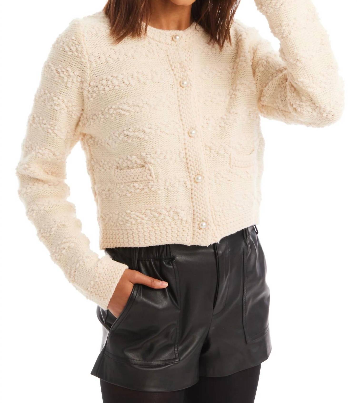 Throw this adorable cardigan over any cami or tank top. Elevate your wardrobe with the Lucy Cardigan Sweater by ALLISON NEW YORK, blending classic and sophisticated design. Featuring long sleeves and crafted from a textured Viscose Blend, this ivory cardigan boasts a modern 18.75" length. With a crewneck, pearl button closure, and front slit pockets, it's a chic addition to any ensemble. Care for this delicate piece with dry cleaning to ensure its lasting elegance.
