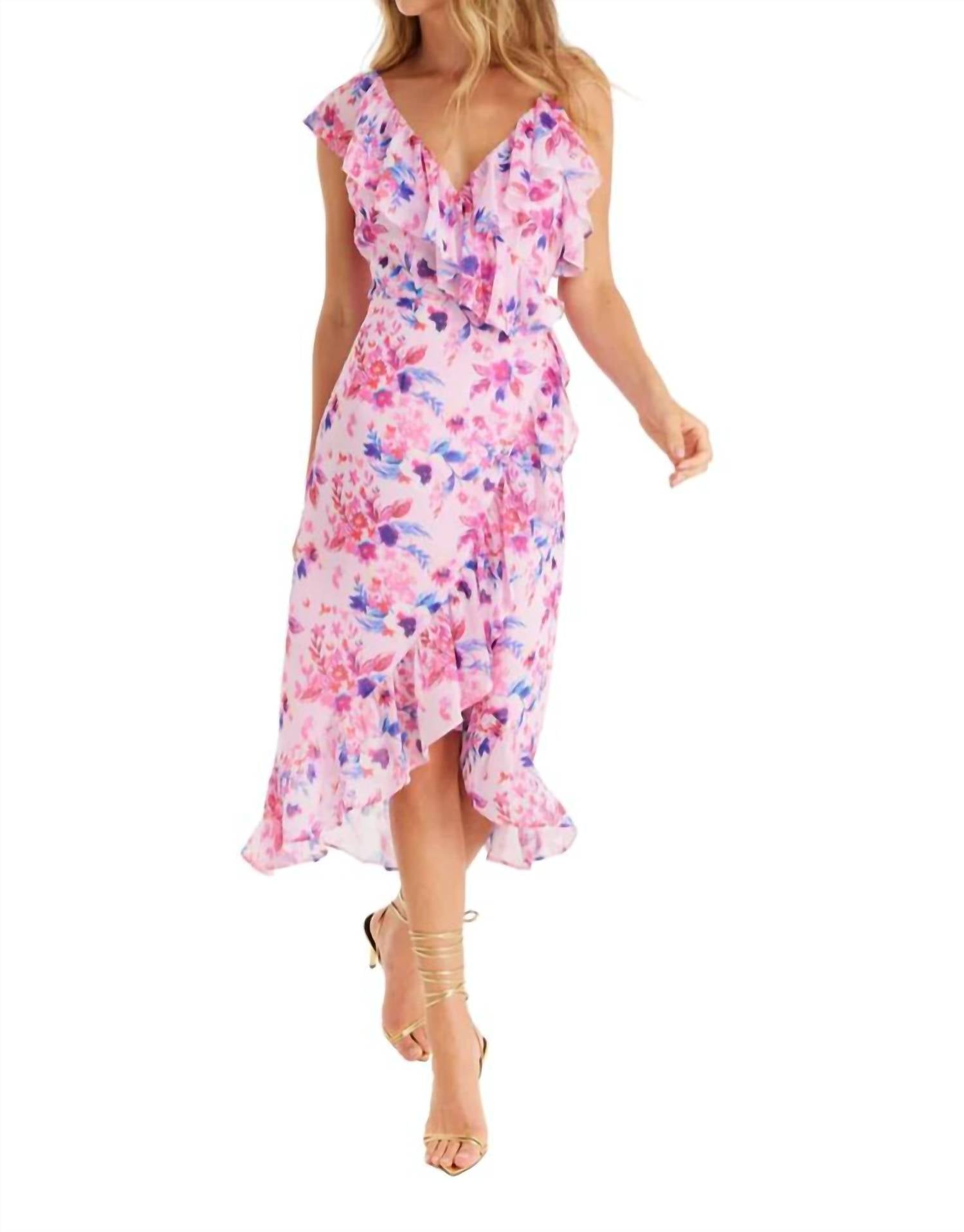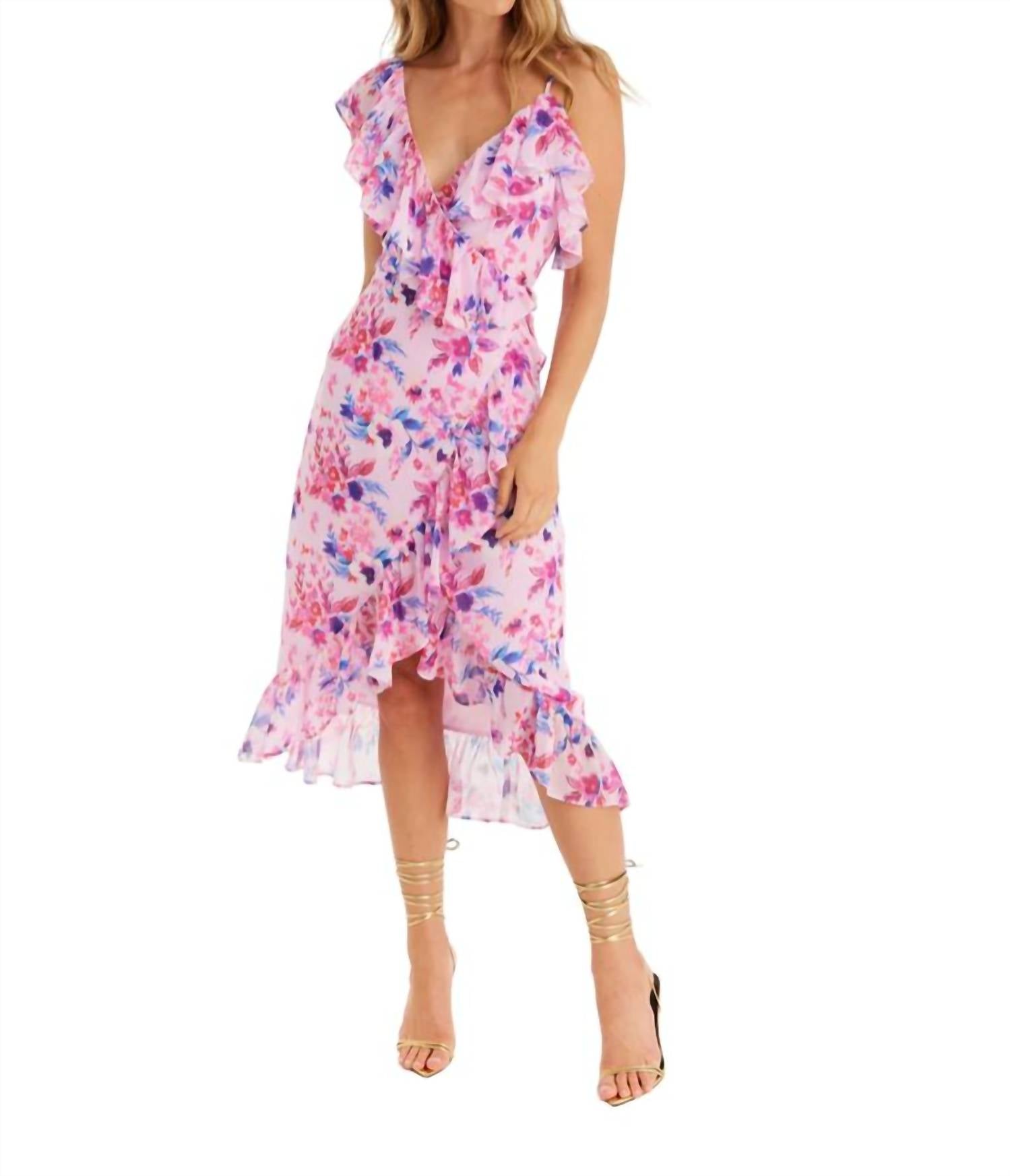 The Ophelia Dress is cut in a lightweight fabrication. Designed with a v neckline and asymetrical straps. Soft ruffles. Wrap waist. Fully lined. Body: 100% Polyester | Lining: 100% Rayon. Hand wash, lay flat to dry or dry clean. Model is wearing a size small and is 5'9"