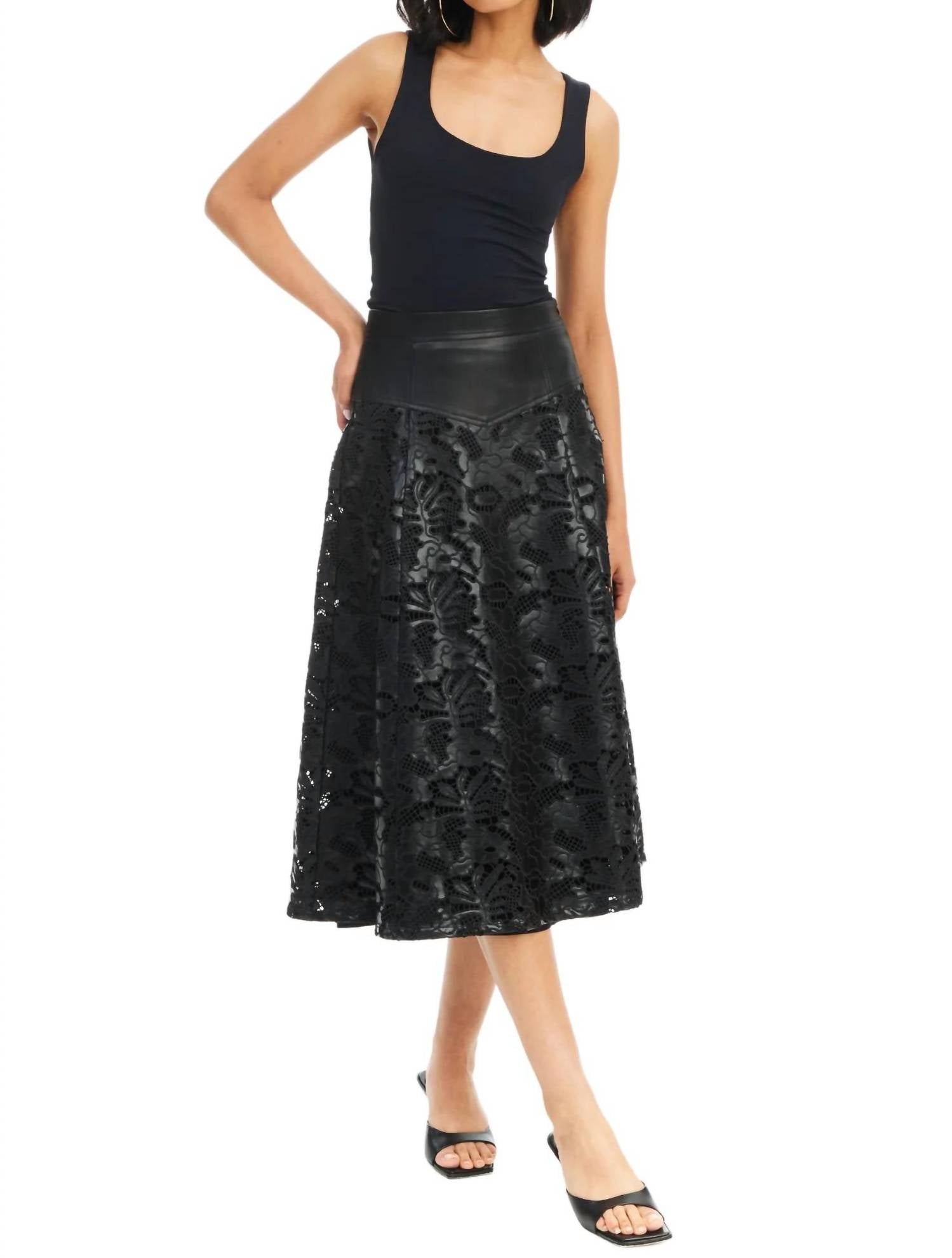 Tuck your favorite tee into this midi length skirt for an effortlessly cool look. Elevate your wardrobe with the Mila Midi Skirt by Allison New York, a chic piece in solid black that exudes elegance. This skirt is constructed from a custom faux leather laser-cut fabrication composed of polyurethane, featuring a stylish A-line design. Measuring 31.25 inches in garment length, it features a fixed waistband and fitted yoke panel to enhance your silhouette. Closure is a convenient pull-on style, and it requires dry cleaning to maintain its sleek appearance.